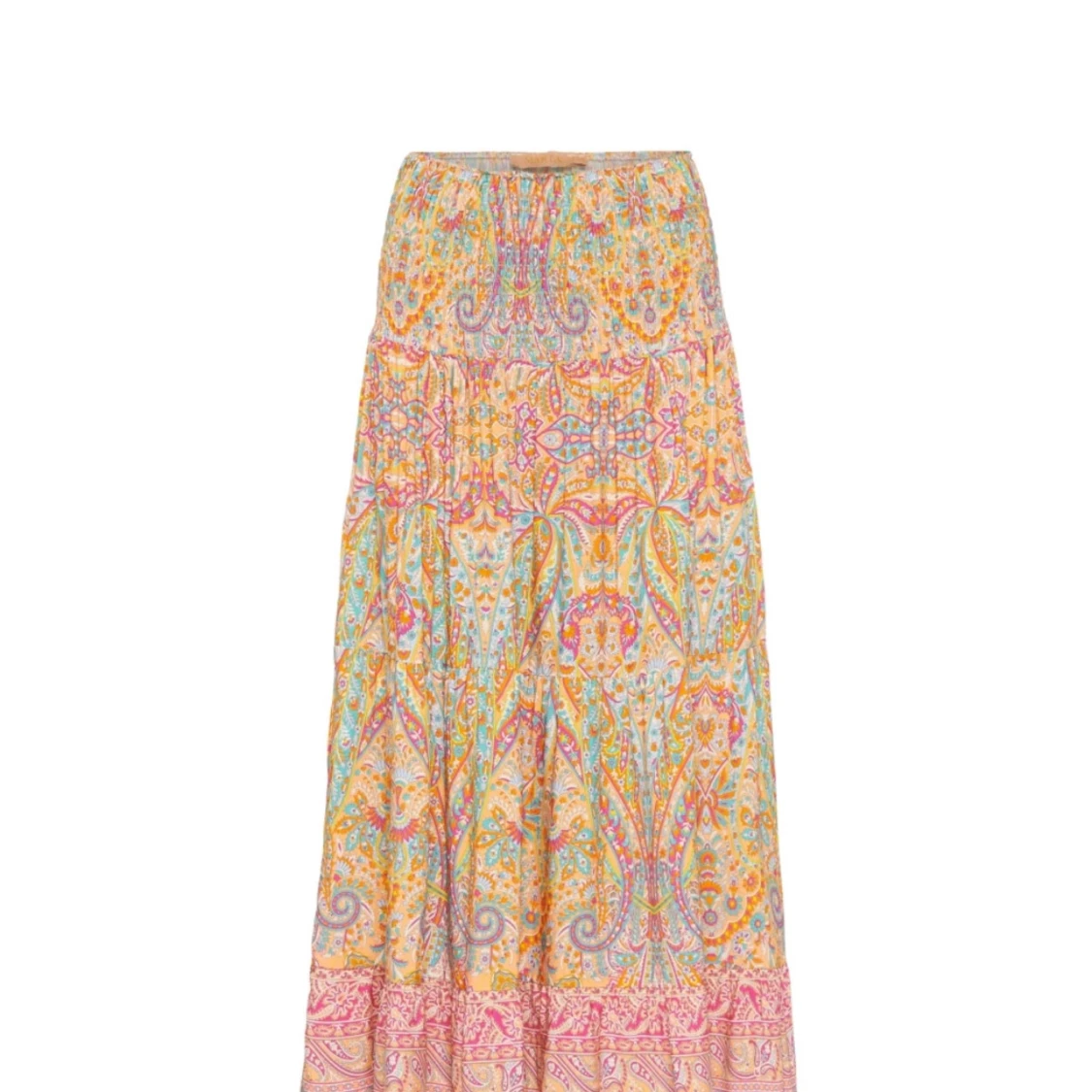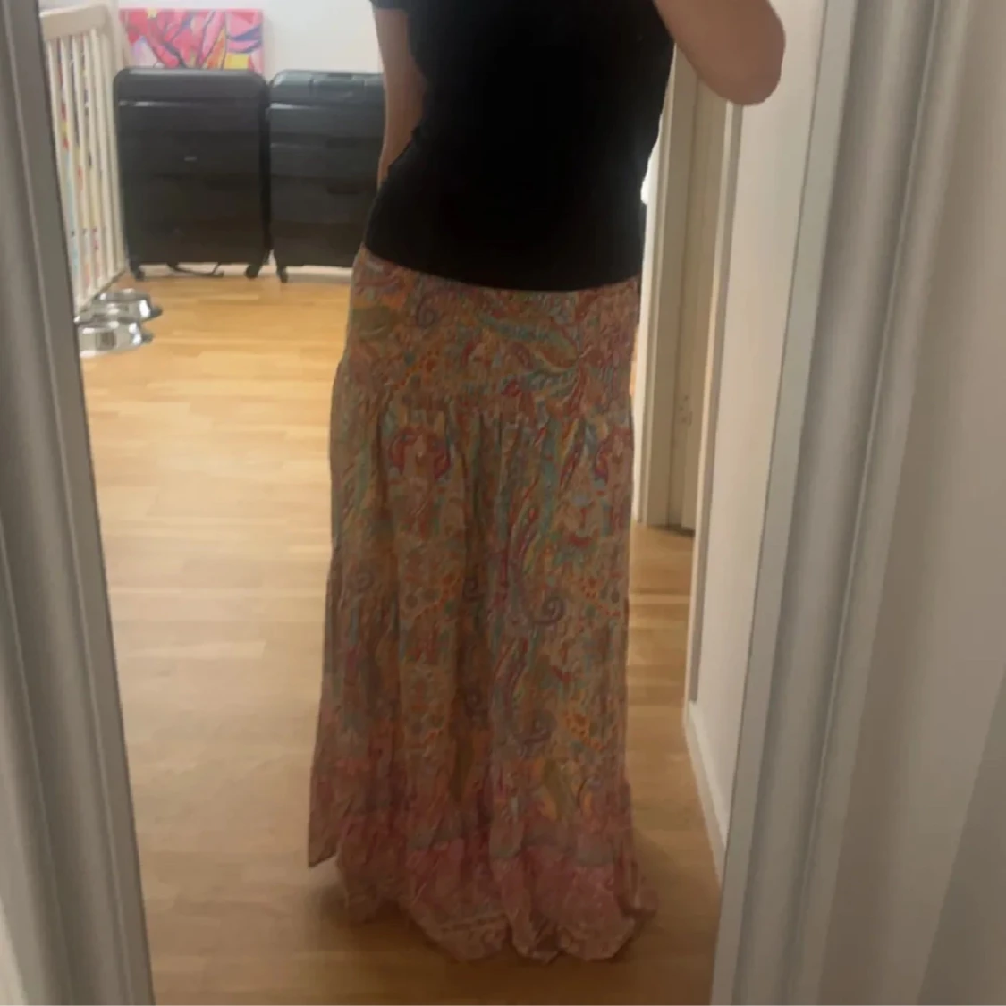 Säljer en färgglad långkjol med ett vackert mönster i pastellfärger som rosa, orange och blå. Kjolen har en bekväm passform och är perfekt för varma dagar.