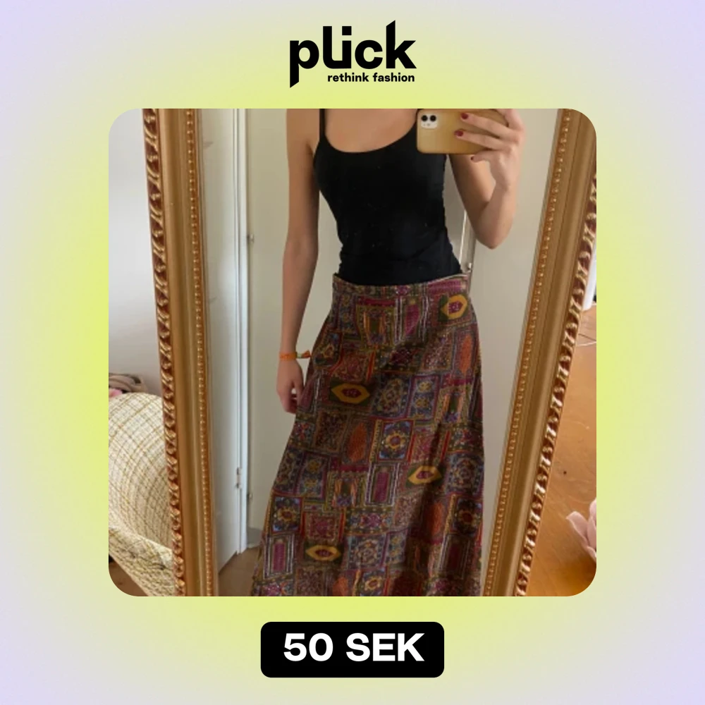 Mönstrad maxikjol i tjockt material med lite hippiekänsla. Stor passform, skulle säga att storleken är någonstans mellan S och M, beroende på om man har den låg- eller högmidjad. Mycket cool!