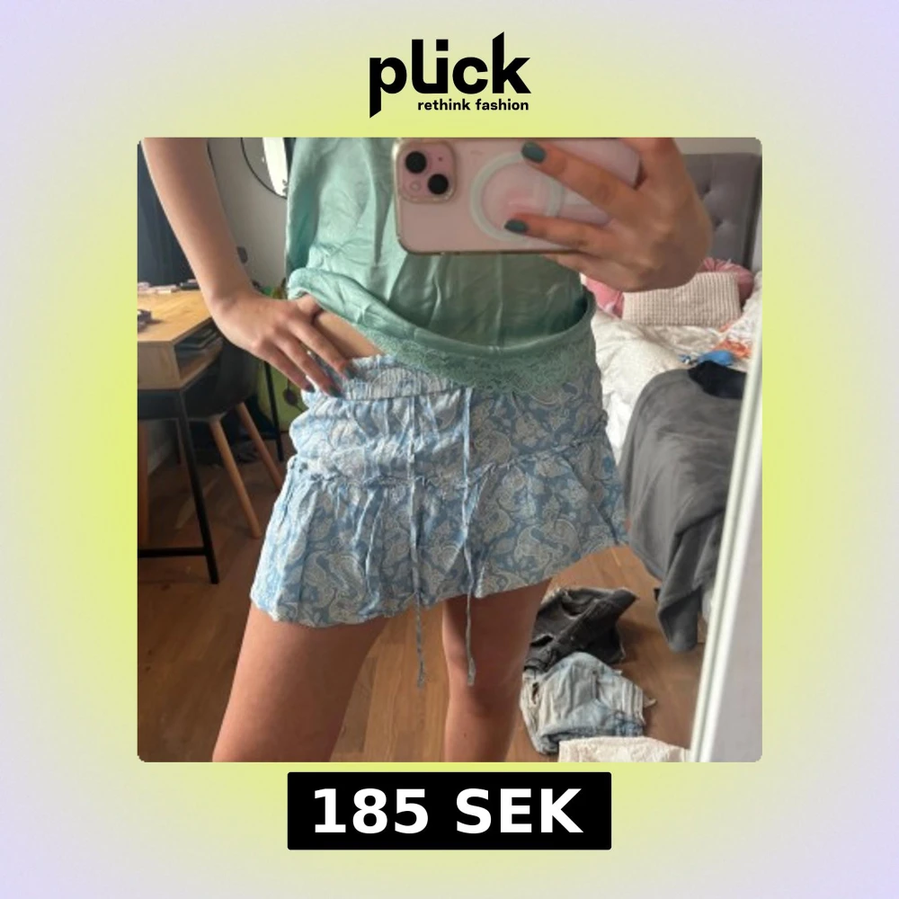Supersöt blåvit mönstrad kortkjol med och volangkant. Kjolen har resår i midjan och knytband framtill för extra passform. Perfekt för varma dagar och ger en fräsch look. Sparsamt använd, så nästan i nyskick!