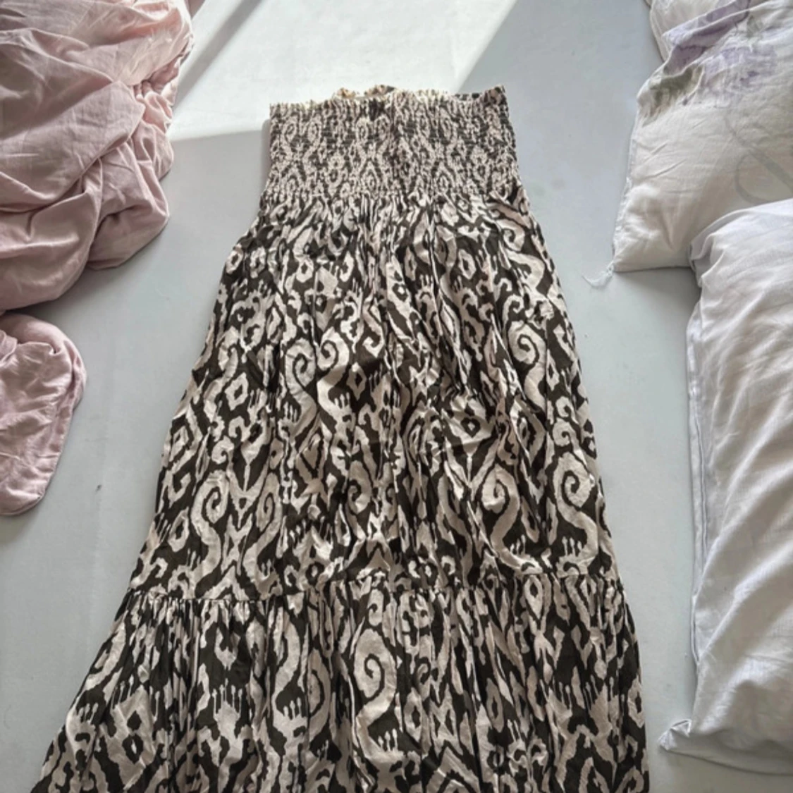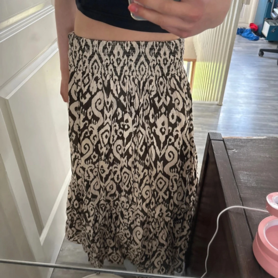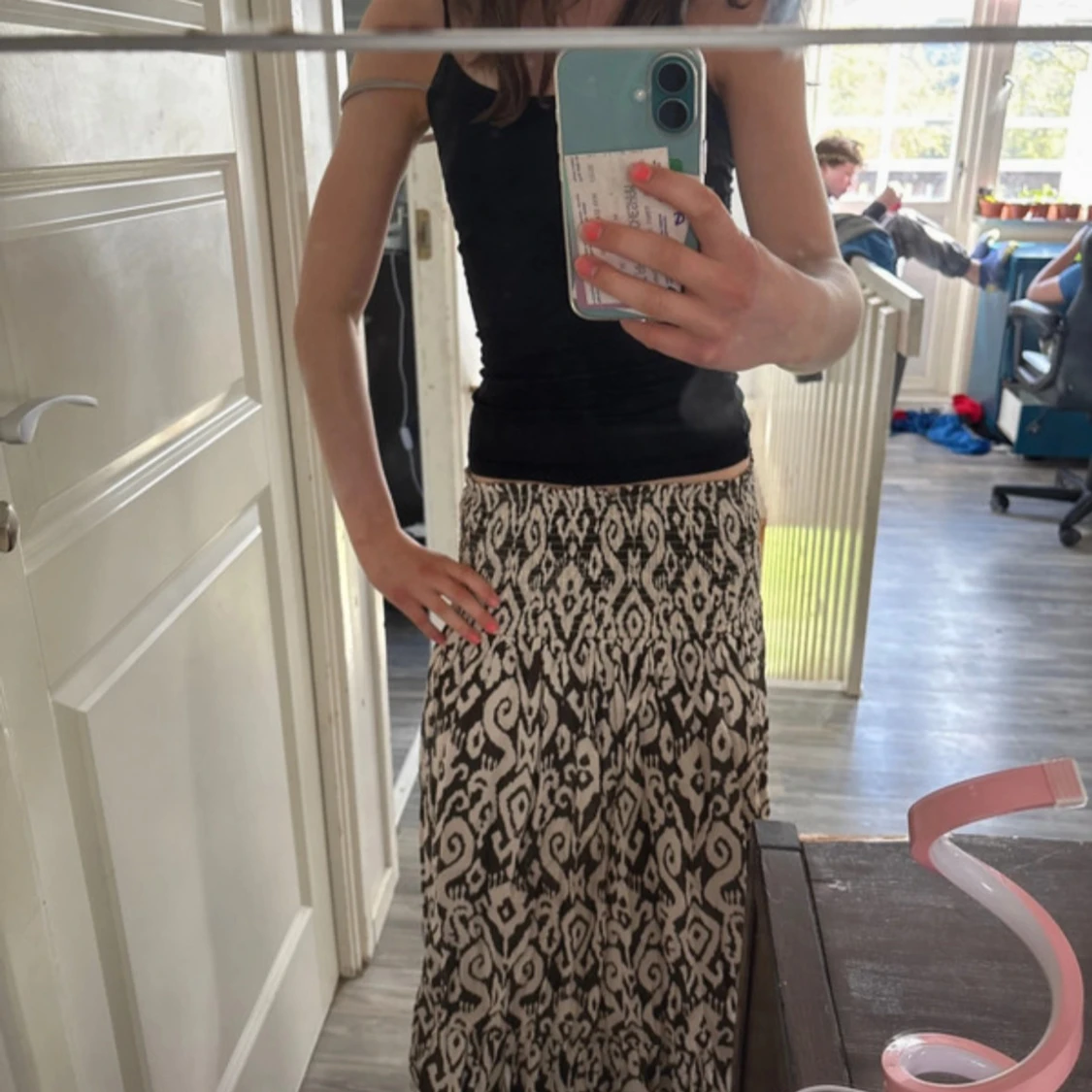 Säljer en svartvit långkjol med grafiskt mönster och smock i midjan. Kjolen har en luftig och flowy passform, perfekt för varma dagar. Tyget är mjukt och bekvämt, och midjan är elastisk för extra komfort.