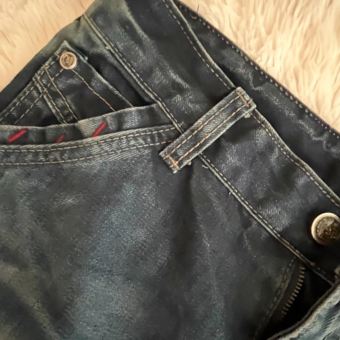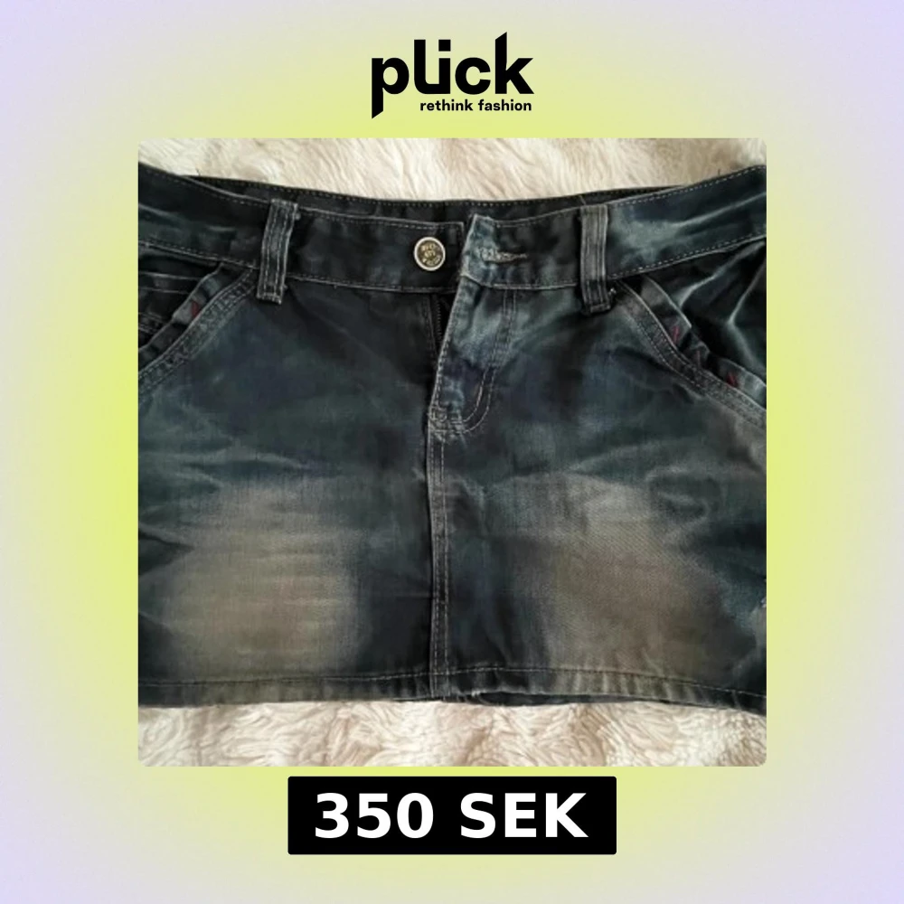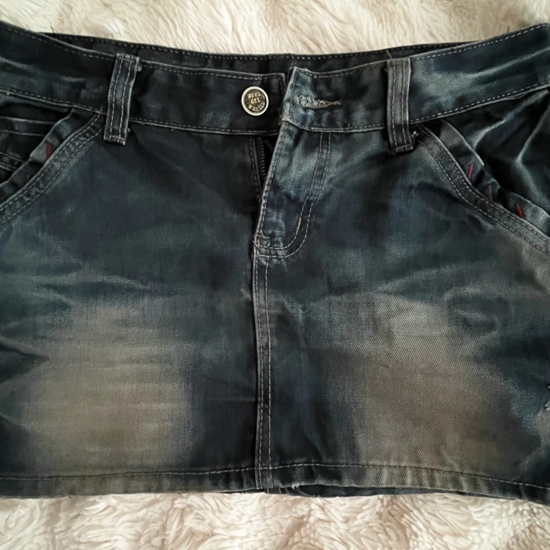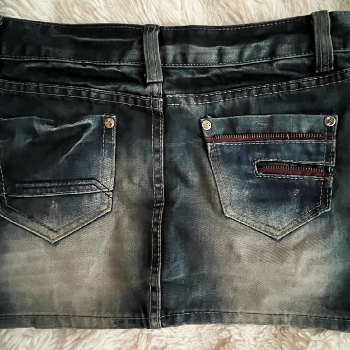 Snygg mörkblå jeanskjol med snygga detaljer och coola fickor både fram och bak. Kjolen har bälteshällor, knapp och dragkedja framtill samt röda sömdetaljer vid fickorna. Helt oanvänd.