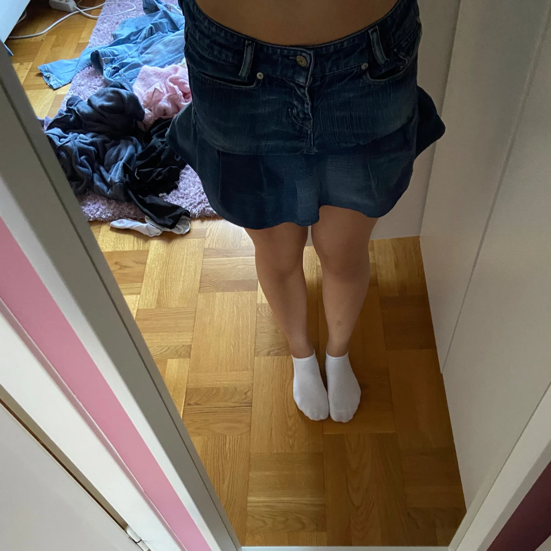 Supercool jeanskjol med volang. Den var ett par denimjeans förut, men jag har sytt om till kjol. Bra skick, meddela gärna om du har någon fråga🥰