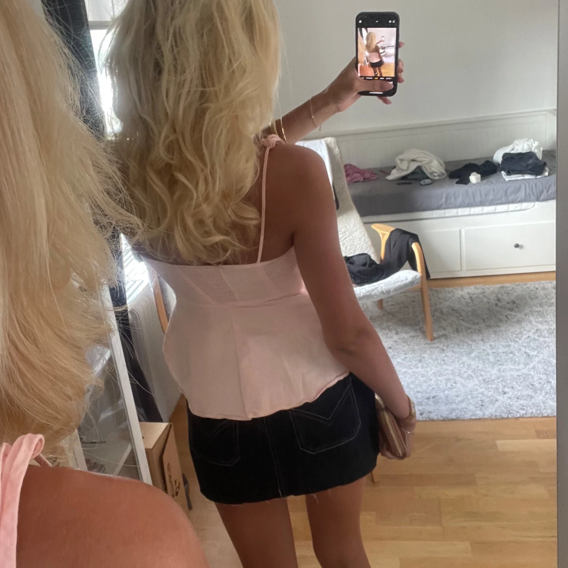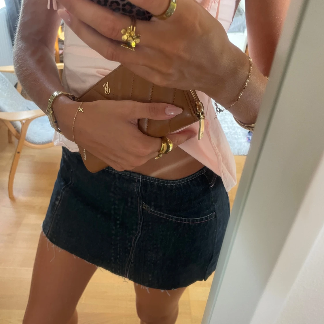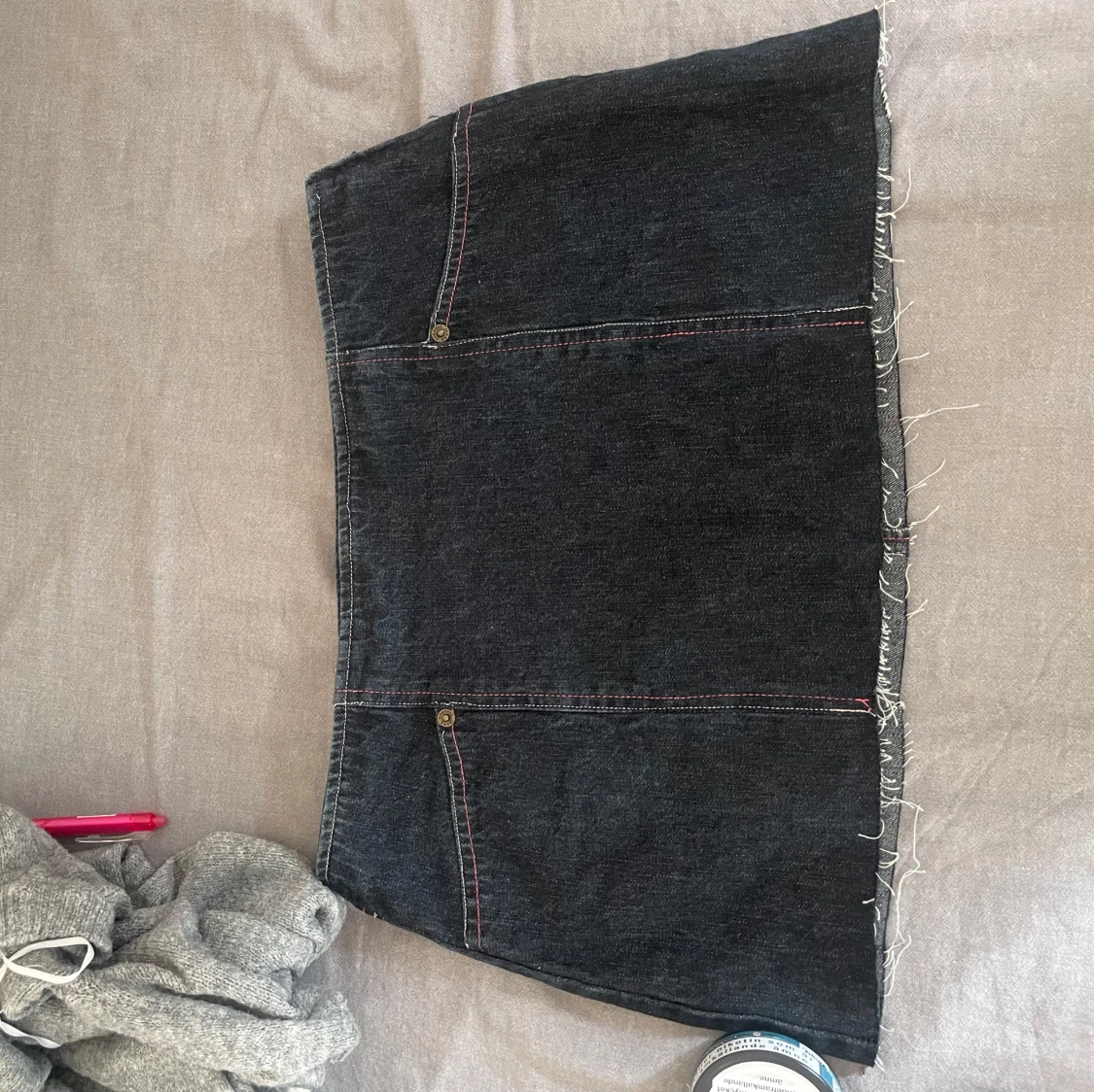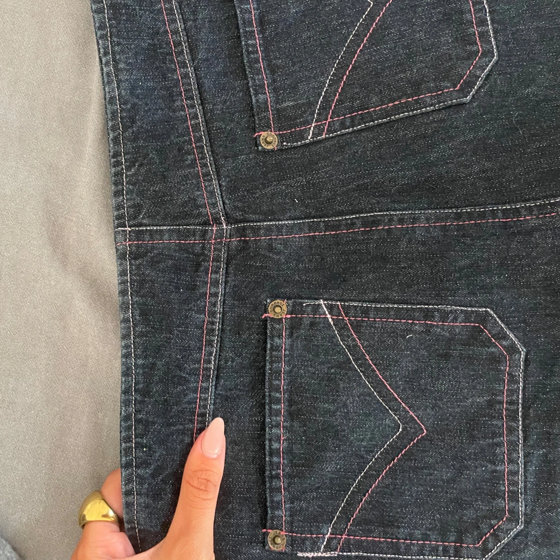 Cool mörkblå jeanskjol med rå, fransig kant och kontrasterande rosa sömmar. Kjolen har fickor både fram och bak med snygga detaljer i sömmarna. Passformen är normal och kjolen är kort, perfekt för dig som gillar en edgy och avslappnad stil. Har själv gjort om kjolen från en längre kjol och bytt färg på tråden till rosa💕