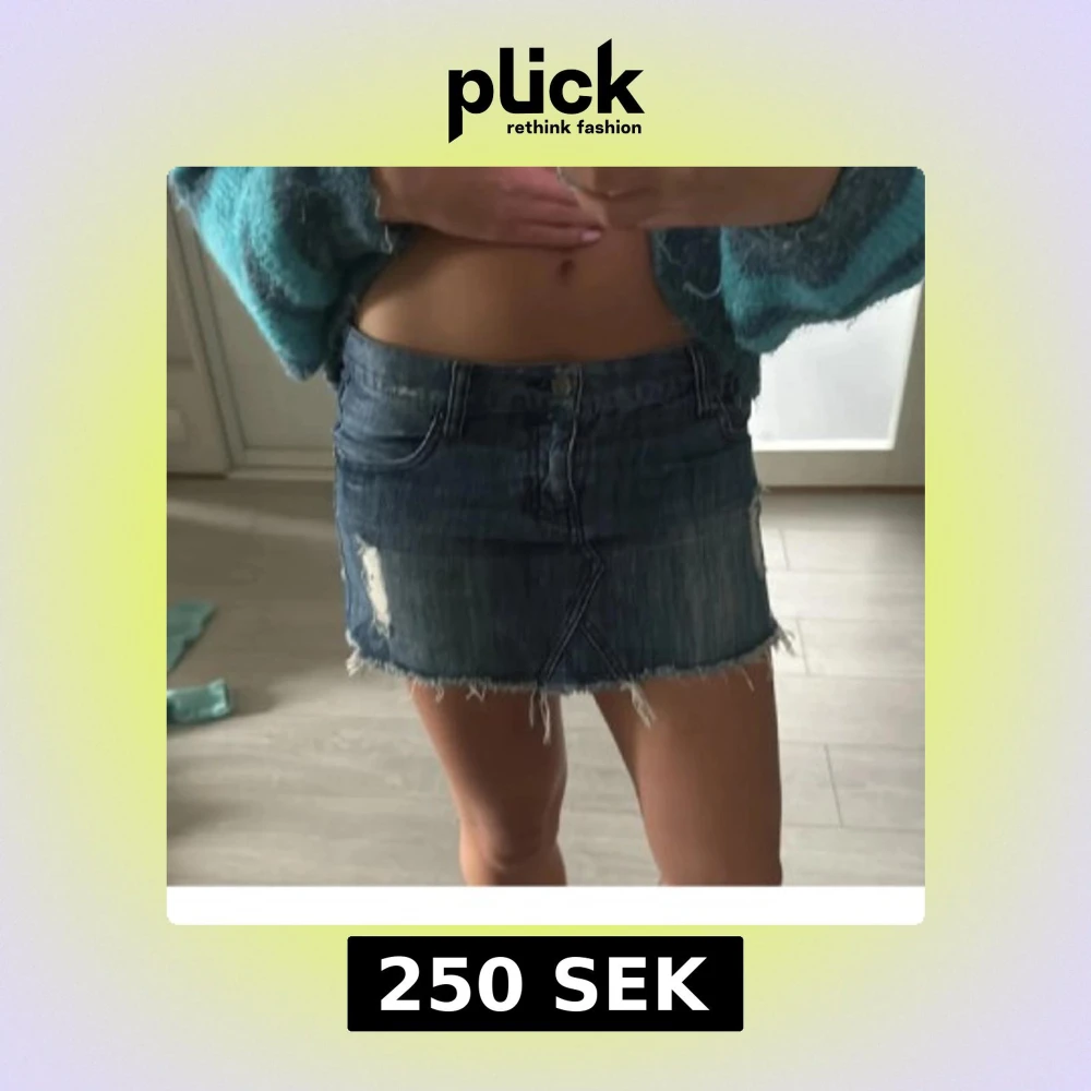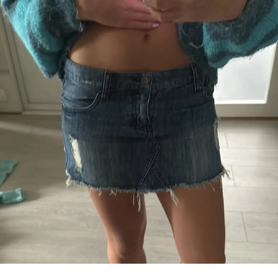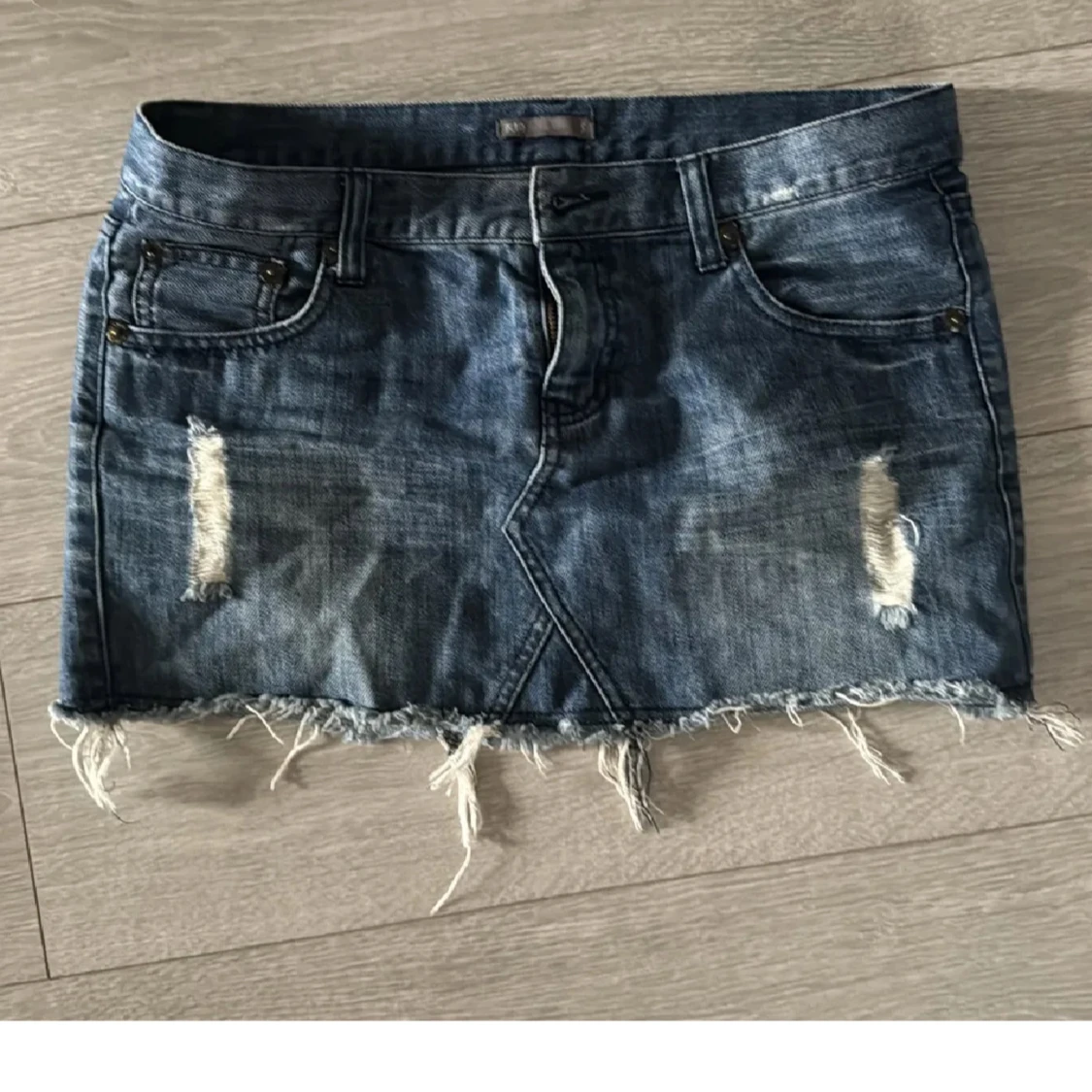 Säljer en kort jeanskjol i mörkblå denim med coola slitningar och fransig nederkant. Kjolen har klassiska fickor fram och bak, samt knapp och dragkedja. Perfekt för dig som gillar en edgy och avslappnad stil.