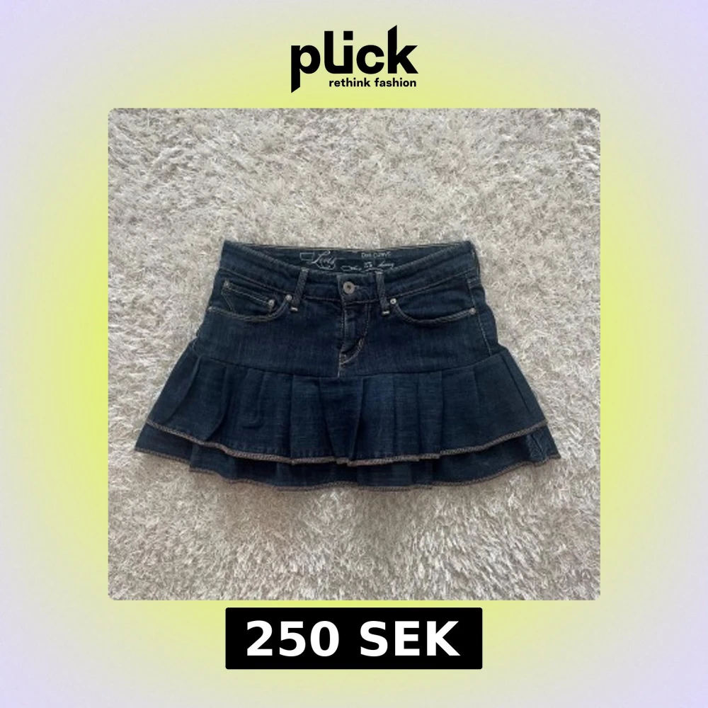 En lågmidjad jeanskjol omsydd från ett par jeans. Midjemått tvärsöver - ca 35cm Längd - 32cm