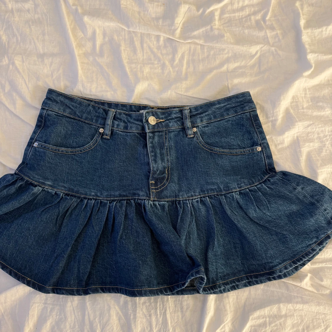 Supersöt mörkblå jeanskjol med volangkant och klassiska fickor fram. Använd en gång så är i nyskick. Nypris 399kr men helt slutsåld på hemsidan💗