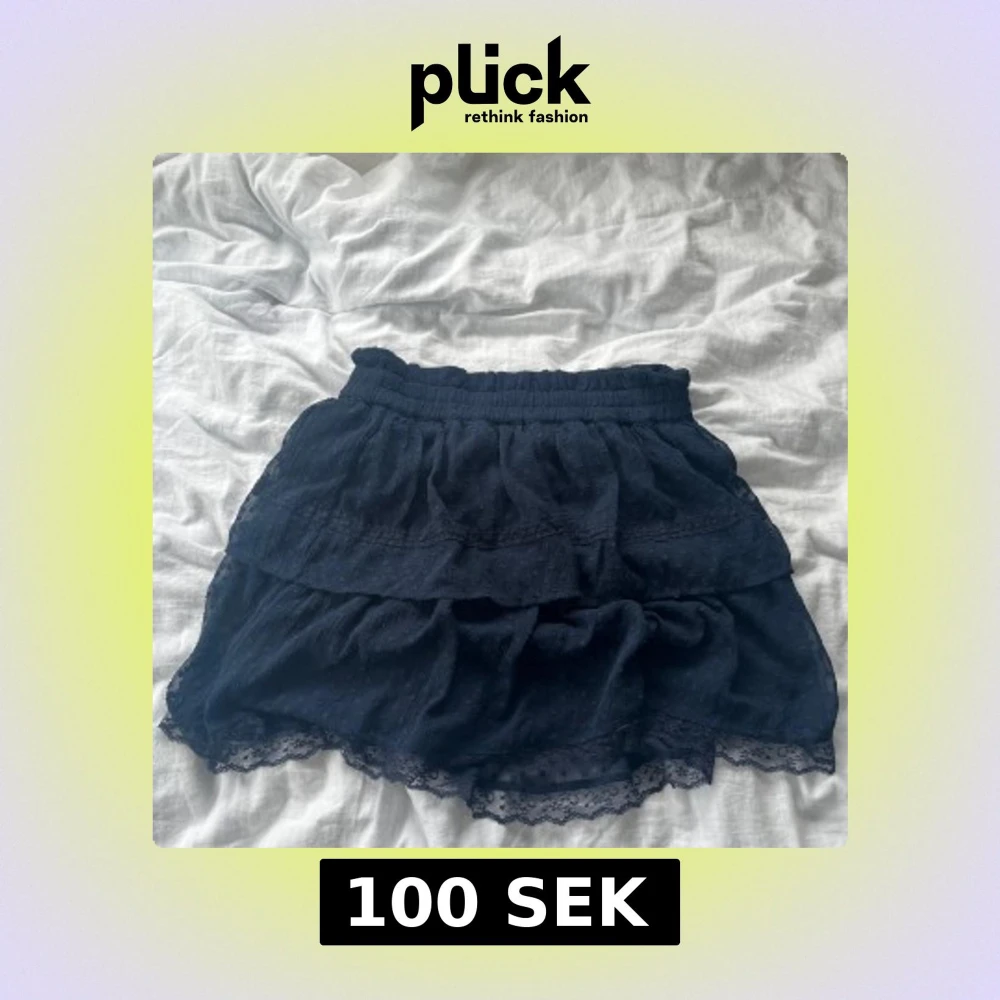 Supersöt mörkblå kortkjol från Vero Moda med volanger och spetskant nertill. Kjolen har resår i midjan och ett diskret prickigt mönster i tyget. Perfekt för dig som gillar en feminin och lekfull stil.