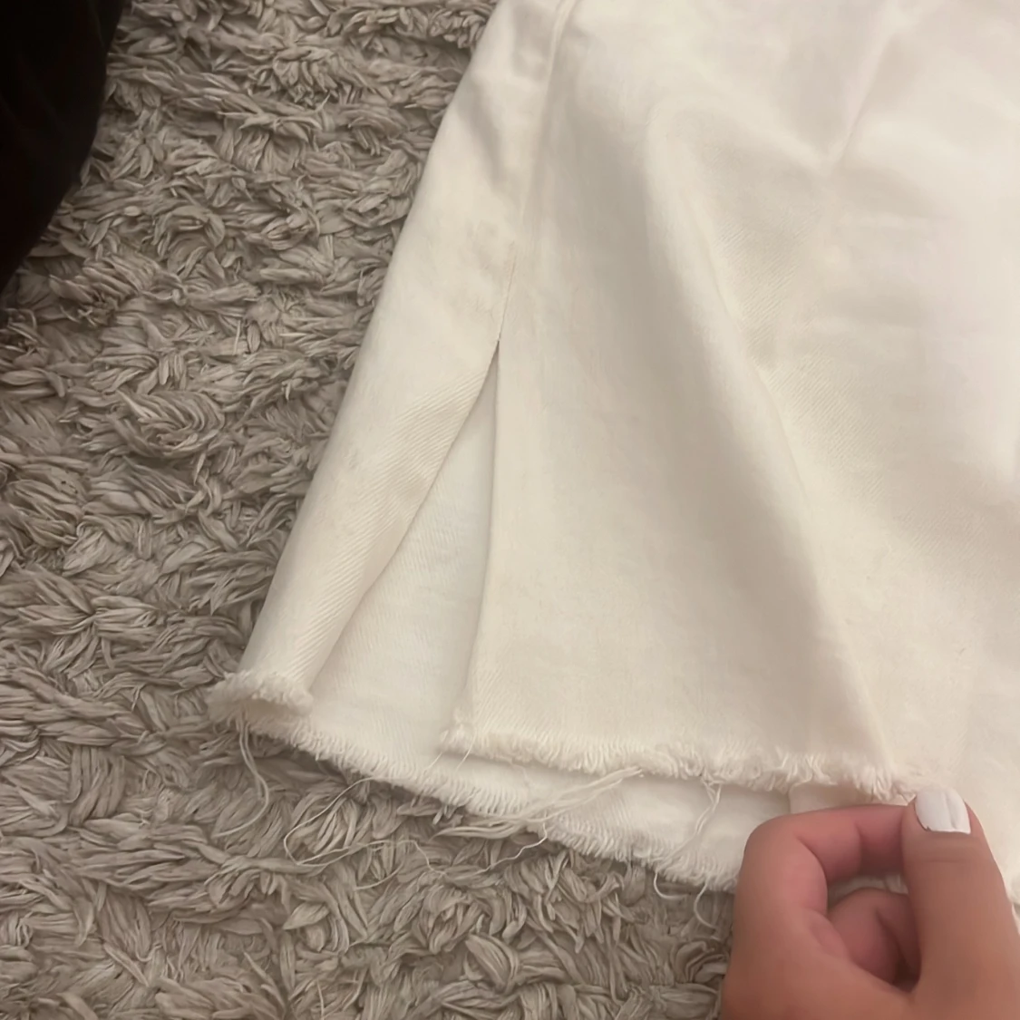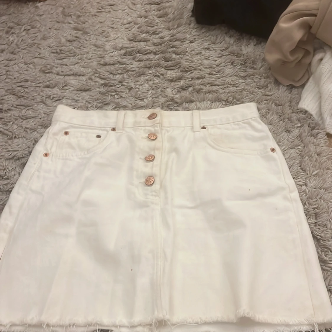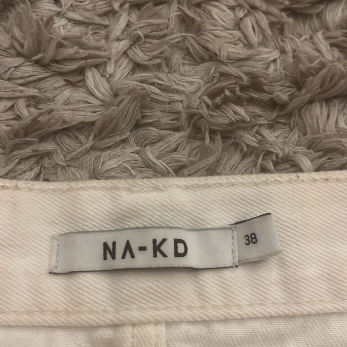 Fin vit kjol från NA-KD i storlek 38. Har gått upp en bit i sömnen (se bild). Men är lätt att laga. Fraktas om köparen står för frakten!