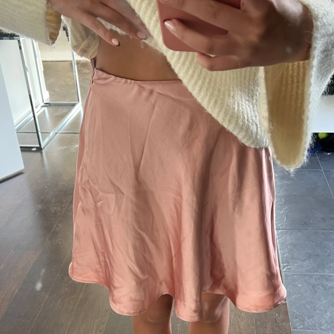 Säljer en söt rosa kortkjol i satin. Kjolen har en mjuk och glansig yta som ger en lyxig känsla. Perfekt till sommaren. Den har en hög midja men man kan vika ner till låg midja, se sista bild!🩷