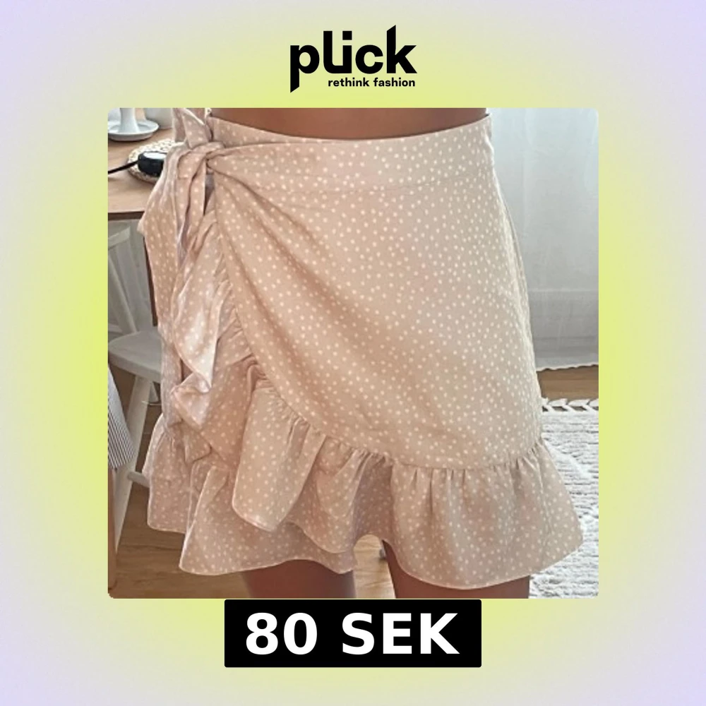 Supersöt beige kortkjol med vita prickar och volangkant. Omlottmodell med knyt i sidan. Nästintill oanvänd! Storlek 36💕