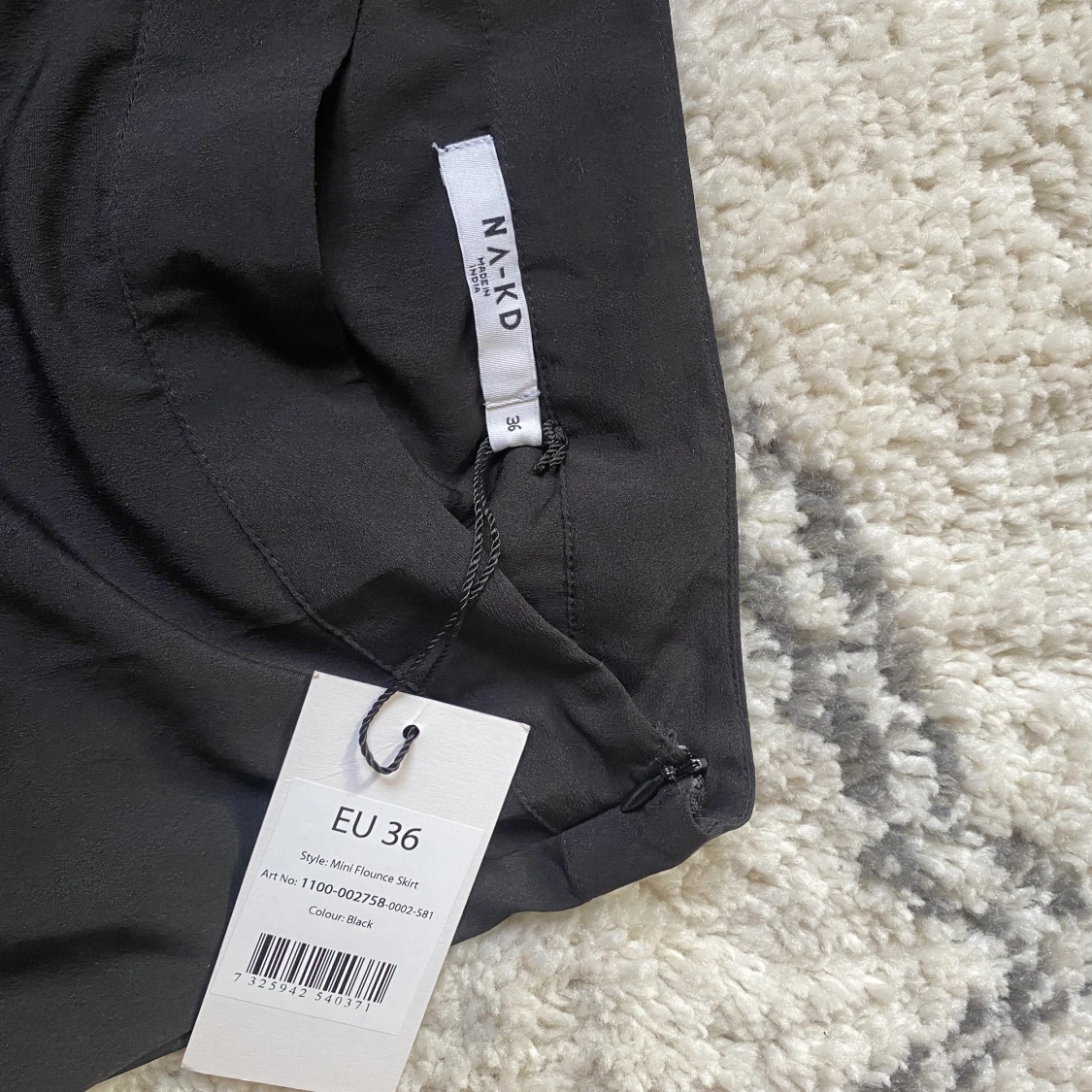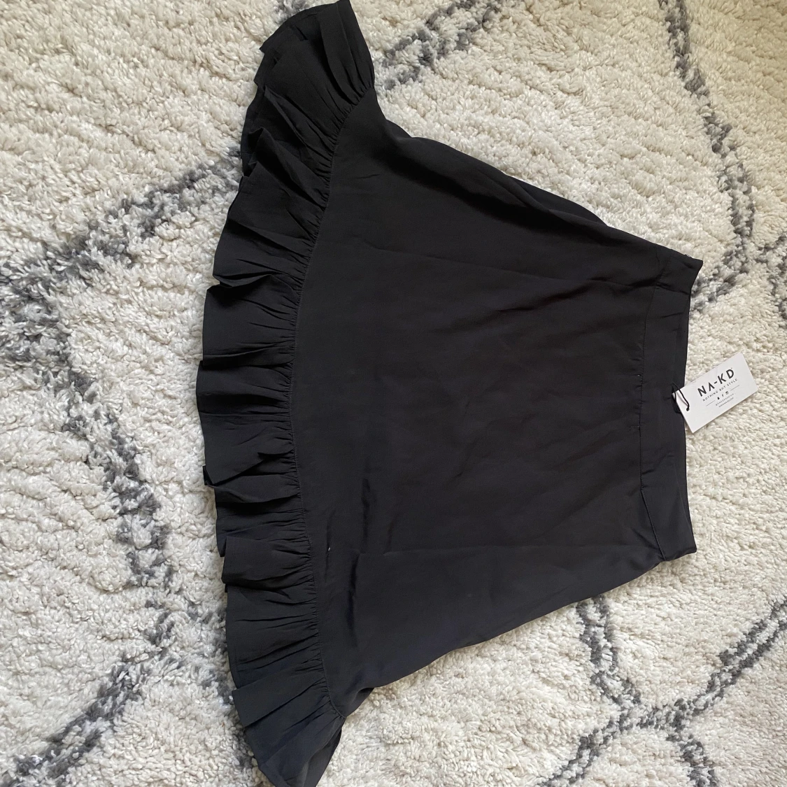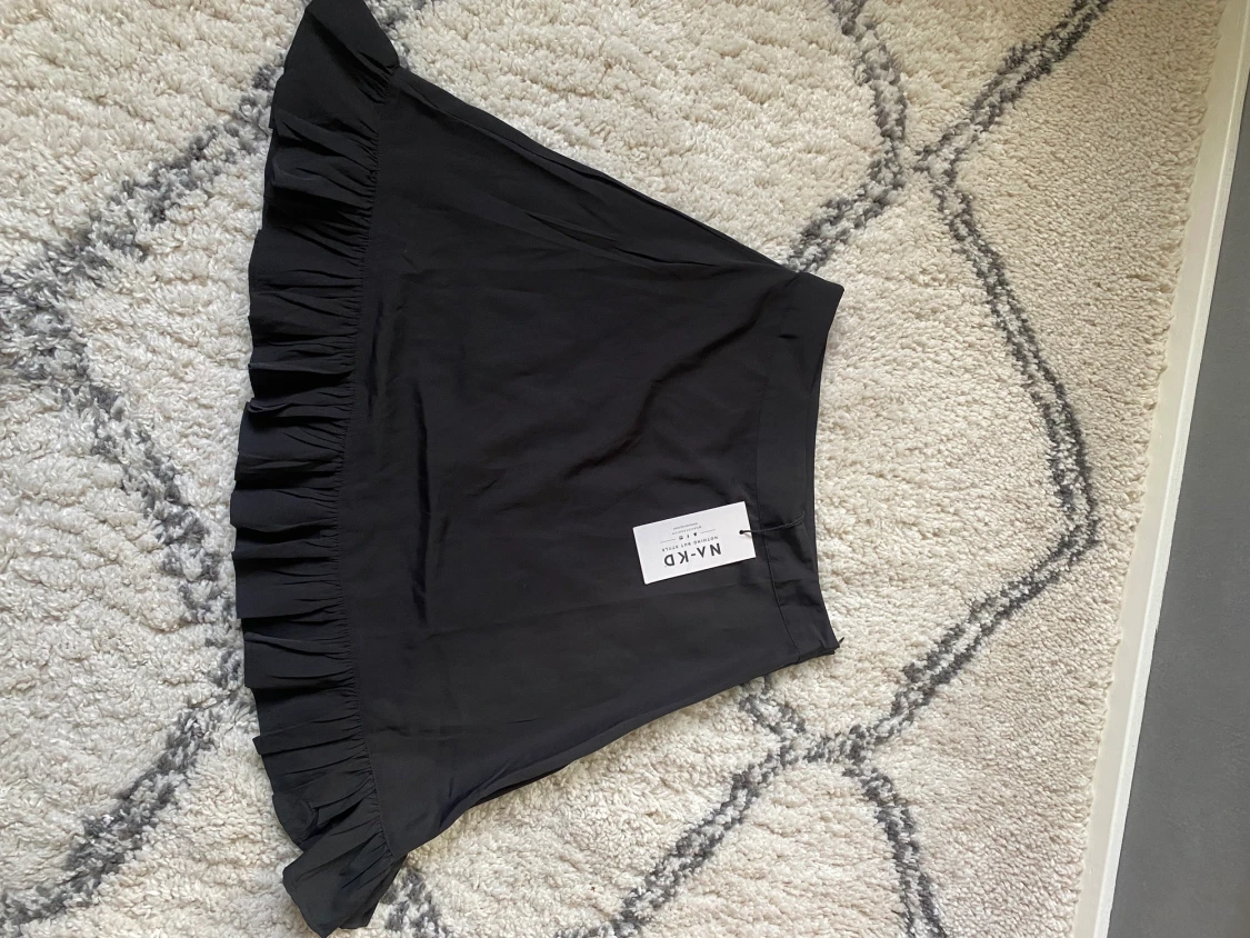 Svart minikjol med volang längst ner. Kjolen har en liten dragkedja vid. Aldrig använd från NA-KD, storlek 36.