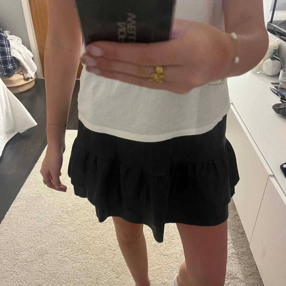 Snygg svart skinnkjol med volangdetaljer. Perfekt nu till nyår!! Super fin passform och har en dragkedja på sidan av kjolen!!🥰🎊