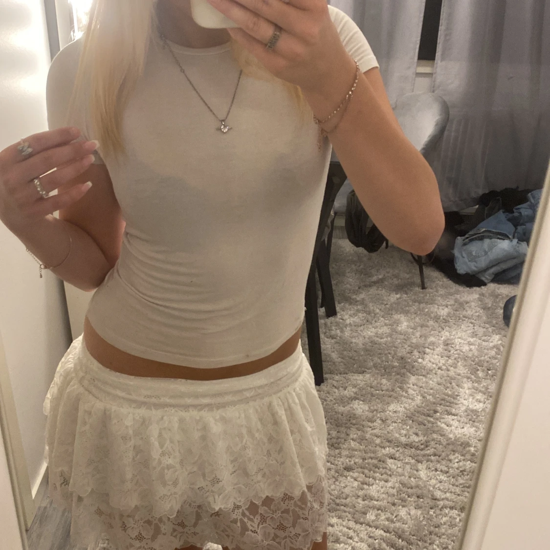 Supersöt vit kortkjol med två lager spets och volangkant. Kjolen har bred resår i midjan och är gjord i ett lätt, transparent spetsmaterial med blommigt mönster.