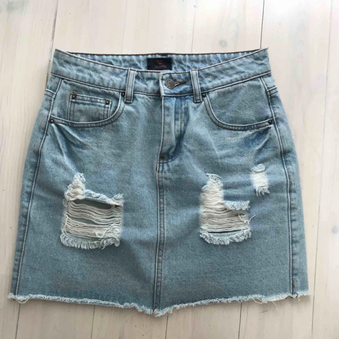 Snygg kort jeanskjol med slitningar. Från Nelly.com och knappt använd. Den perfekta jeanskjolen!