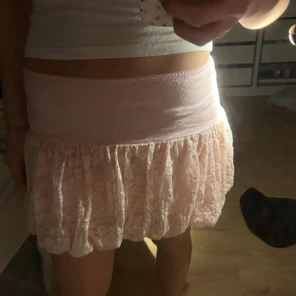 jätte söt spets kjol från märket ”naked eyes”. Tyget är stretchigt. kjolen är low waist. storleken är en one size men passar mig som oftast bär S i kjolar. skulle säga att den även passar xs-m💕