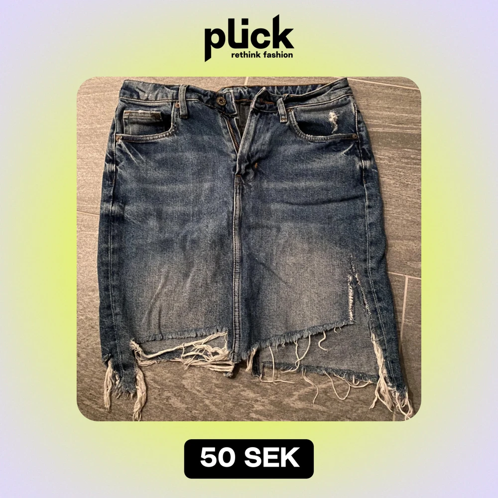Nedsliten jeanskjol med frasande kanter som är en trendig look. Den är typ marinblå med ljus tvätt i mitten. Framhäver dessutom kurvorna 👌