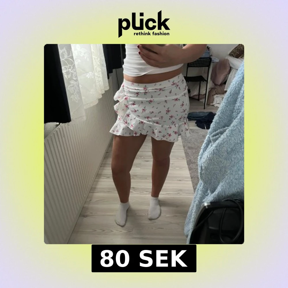 Supersöt vit omlottkjol med rosa blommor och volangkant. Kjolen har en feminin och somrig känsla, perfekt för varma dagar. Den är kort och har en omlottmodell