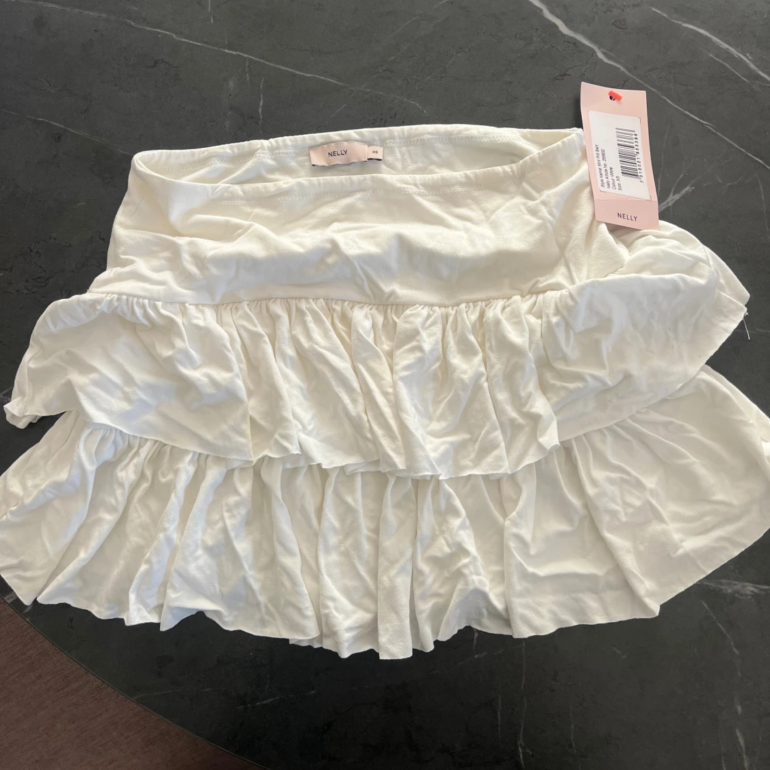 Supersöt vit kortkjol från Nelly med bred midja och dubbla volanger. Kjolen är i mjuk bomull och har en flowy känsla som ger en riktigt fräsch look. Perfekt att styla med en croppad topp eller stickad tröja.