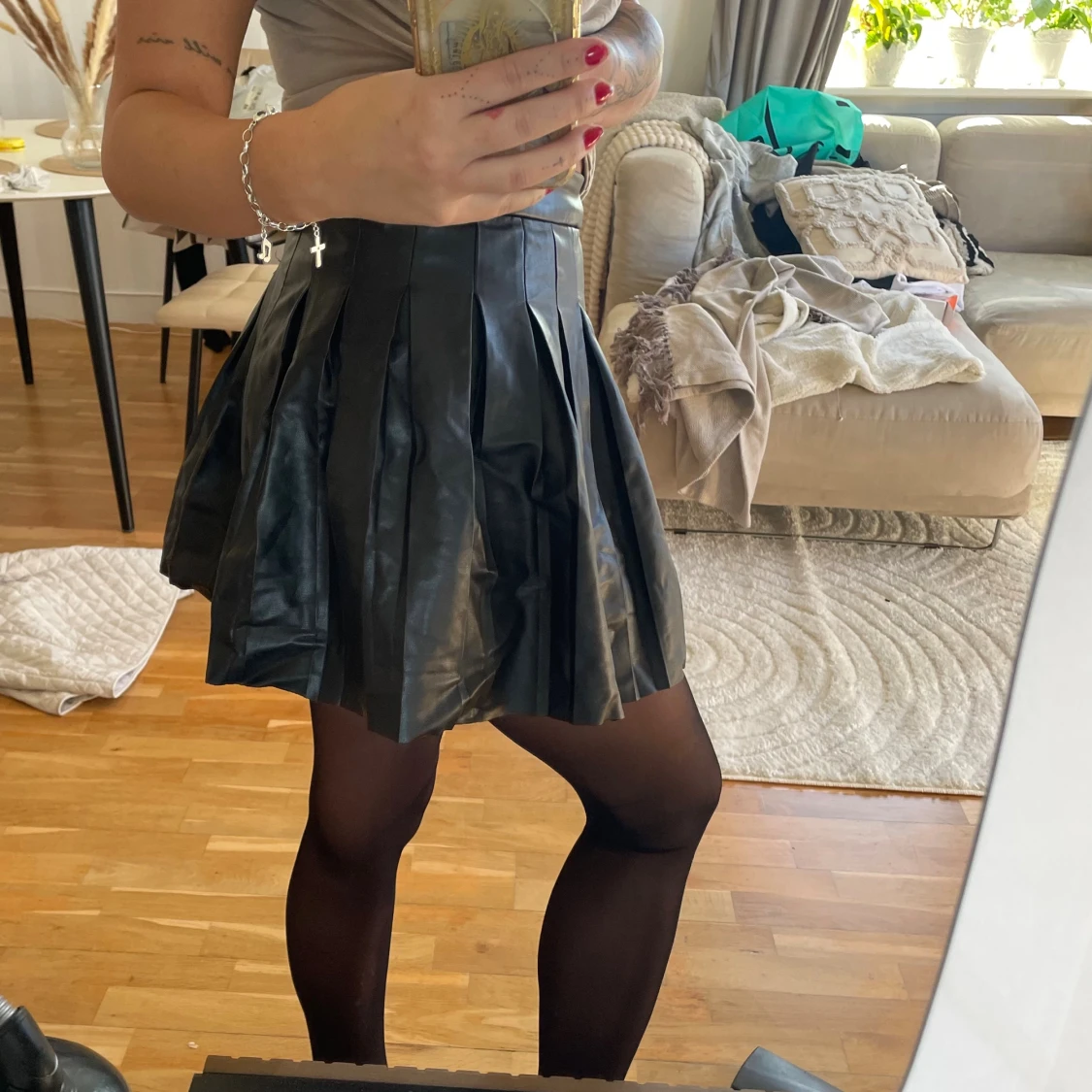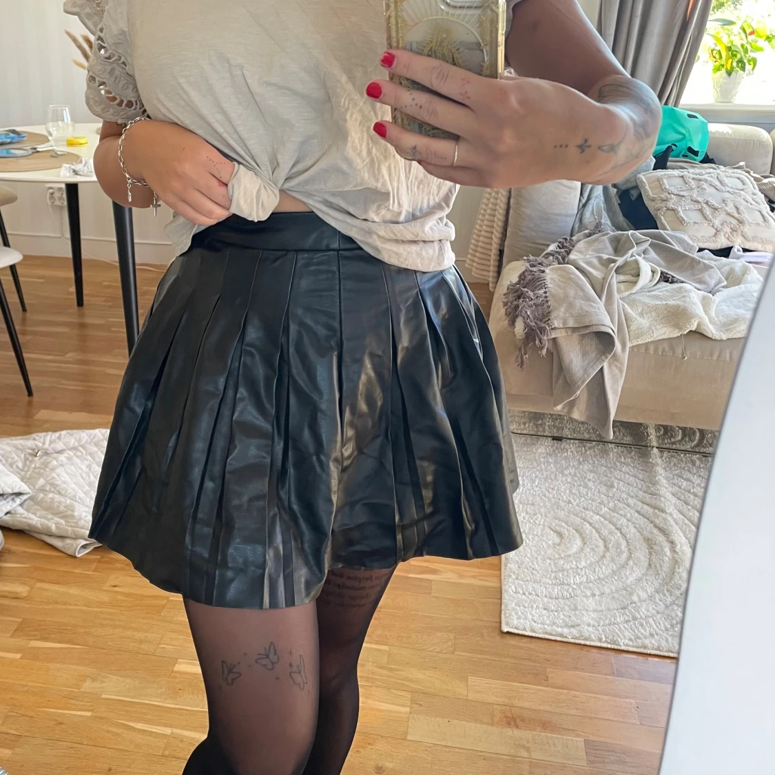 Säljer en svart plisserad kortkjol i skinnimitation. Kjolen har hög midja och breda, markerade veck som ger en snygg volym. Storlek M