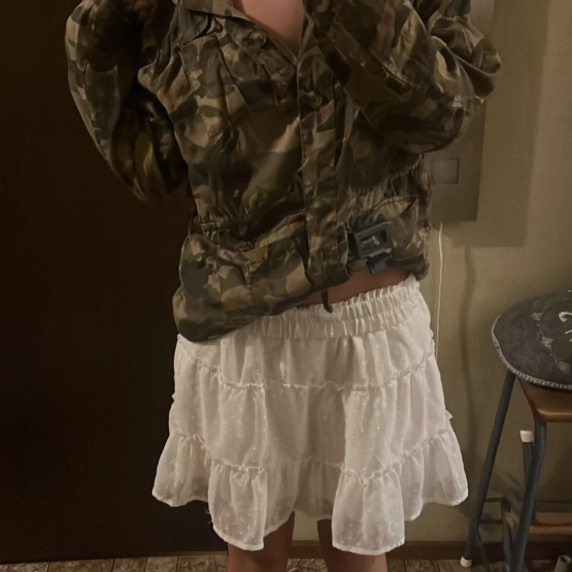 Supersöt vit kortkjol med volanger och diskret prickigt mönster. Kjolen har resår i midjan för skön passform och är gjord i ett lätt, luftigt material som passar perfekt till varmare dagar. Den har en flowy känsla som ger en gullig och trendig look.