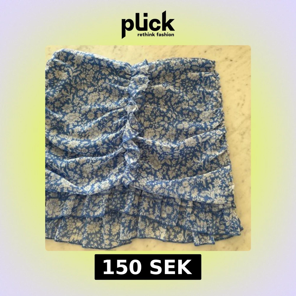 Supersöt kort kjol i blått och vitt med blommigt mönster och volanger. Kjolen har rynkade detaljer framtill och är gjord i ett lätt, luftigt material som passar perfekt till varma dagar. Perfekt för dig som gillar romantisk och somrig stil!