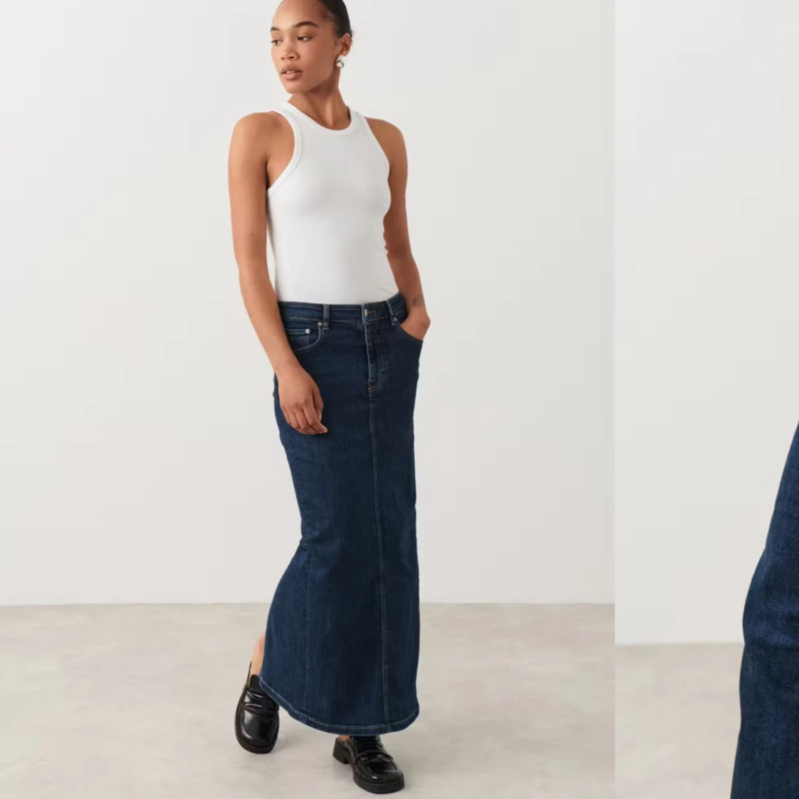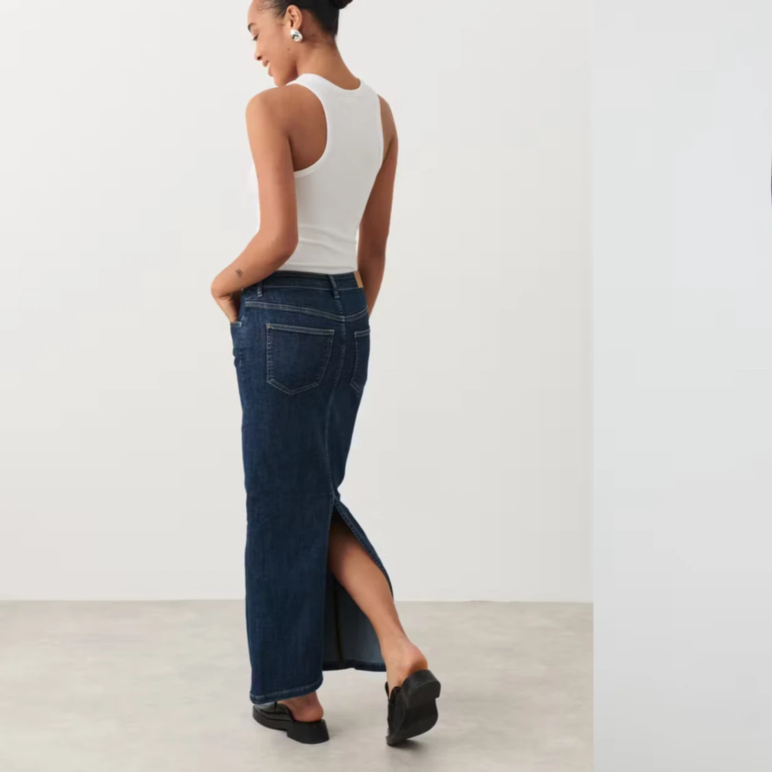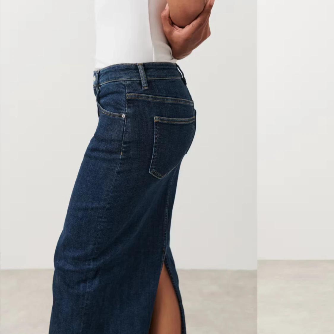 Lång jeanskjol med slits bak. Kjolen är mörkblå och har hög stretch. Den har figurnära passform, medelhög midja, dragkedjegylf och fickor fram och bak. Köpt för 499kr men säljer för 200kr💕 Ser ut som ny🌸💙