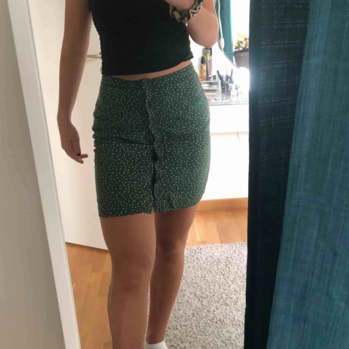 Grön kjol med vita prickar som har super skönt material och alldeles perfekt längd. Köpt för 399kr