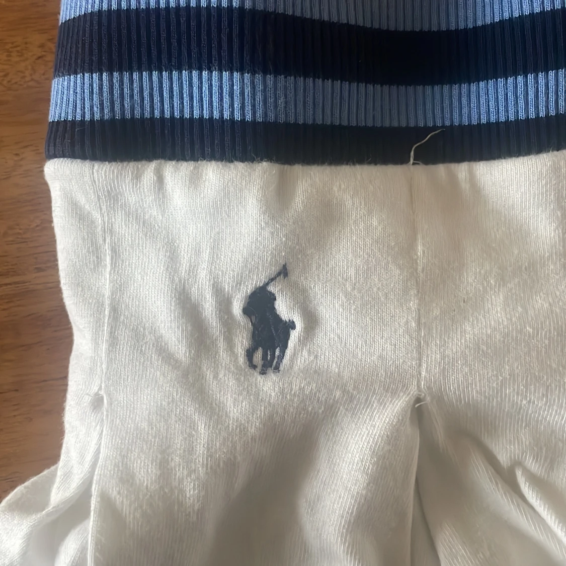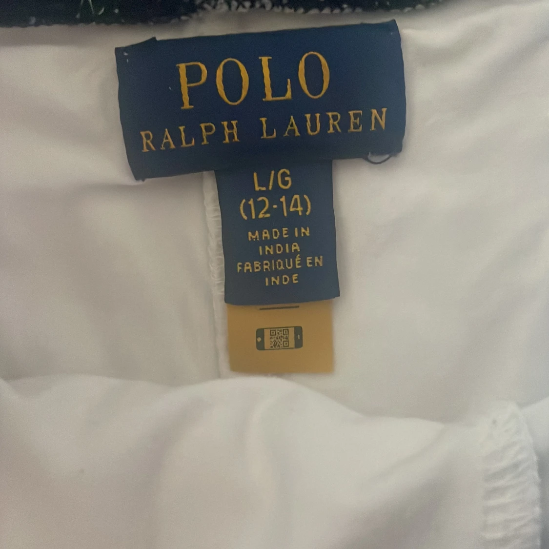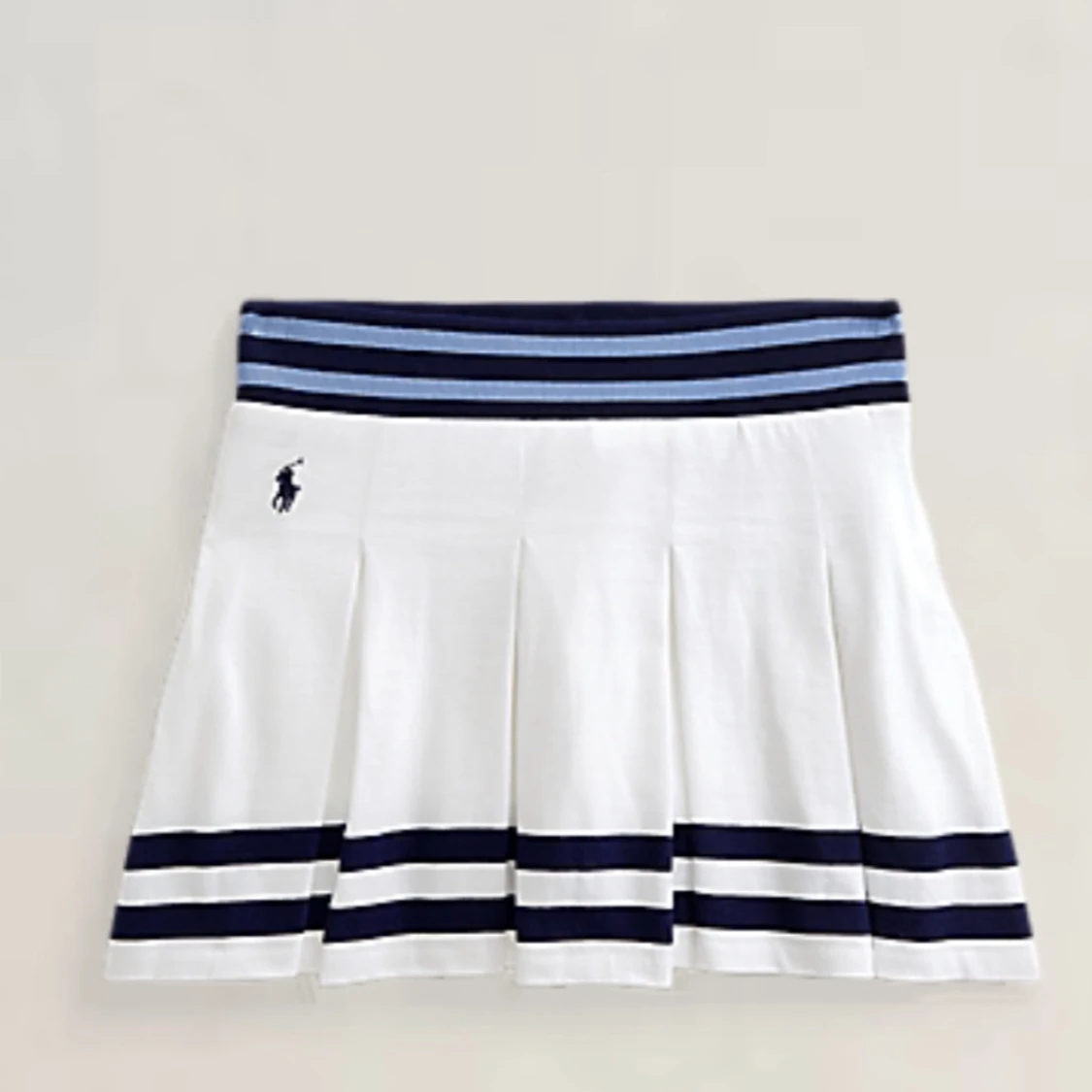 Säljer en vit plisserad kjol från Polo Ralph Lauren med marinblå ränder i midjan och längs fållen. Kjolen har broderad logga framtill och bred resår i midjan för en sportig look.