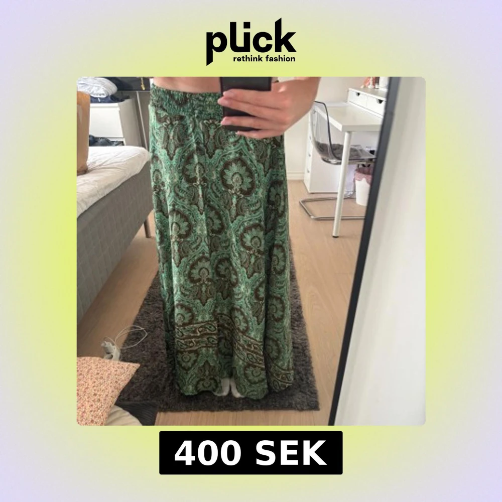 Supersnygg långkjol från Addictive med paisleyinspirerat mönster i grönt, svart och brunt.. Kjolen har elastisk midja och ett flowy fall som ger en chill och bohemisk vibe. Perfekt för dig som vill sticka ut med coola mönster och färger. Även perfekt nu till sommaren. Jag köpte kjolen i Korsika 2023, men har aldrig använt den. Lappen sitter kvar. Skriv om ni har några frågor. Den har inte någon storlek men passar mig som är 175 med storlek xs/s.