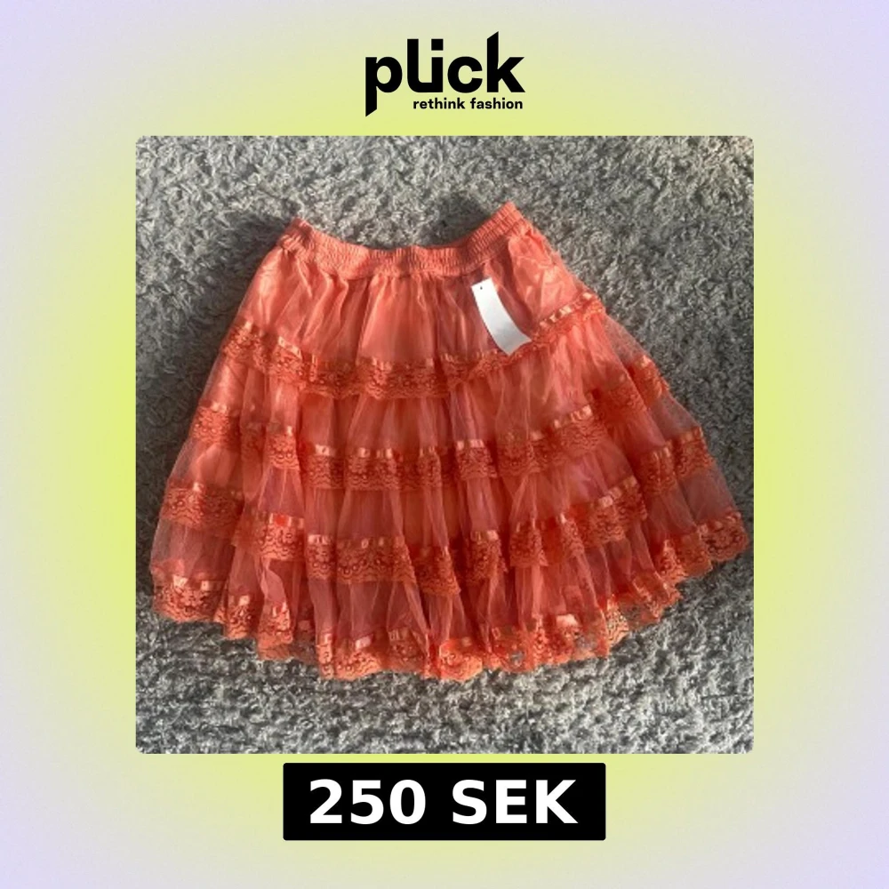 En fluffig orange kjol med flera lager volanger och spetsdetaljer. Kjolen har resår i midjan och är tillverkad i ett lätt, transparent material som ger en luftig känsla.