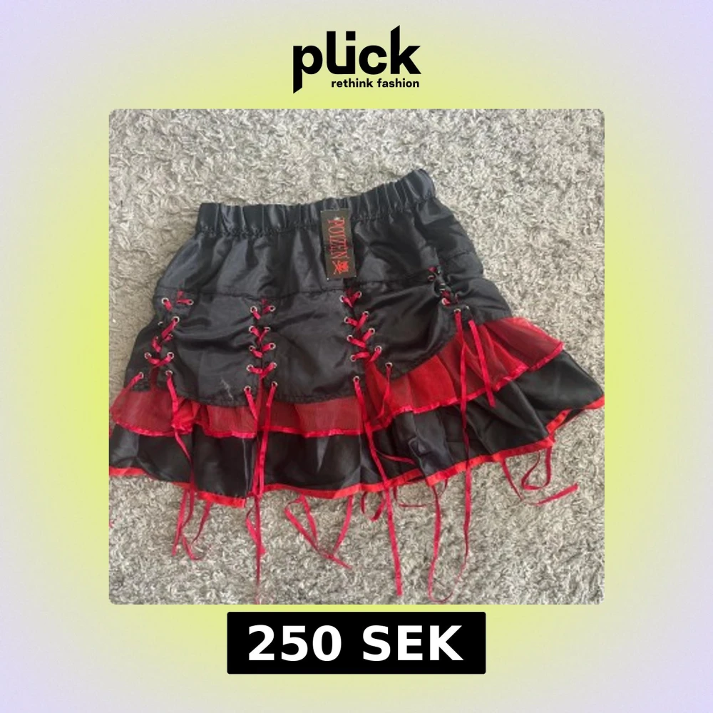 Cool svart minikjol med röda detaljer och snörning framtill och på sidorna. Kjolen har volanger och elastisk midja för extra komfort. Perfekt för dig som gillar alternativ stil och vill sticka ut.