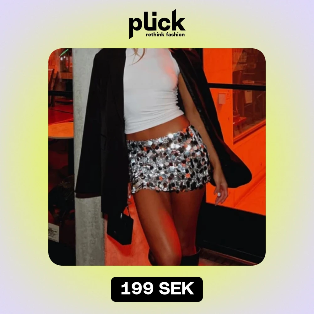Med denna snygga paljettkjol blir du festens höjdpunkt🪩 Bild lånad från hemsidan Endast andvänd en gång, nyskick