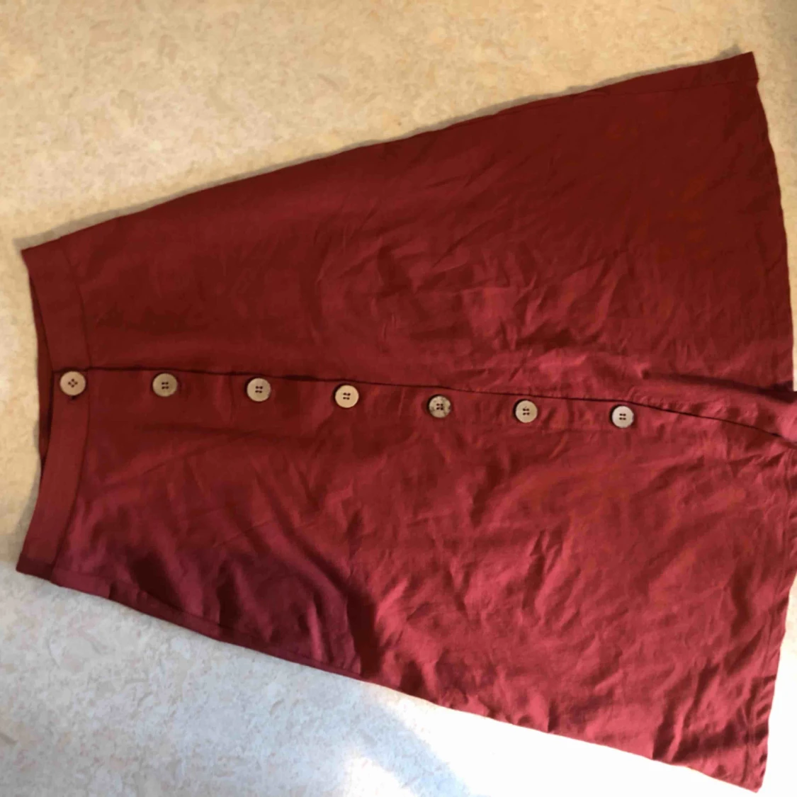 Superfin roströd kjol med träknappar, faller fint då den är lite klockad. Går just ovanför knät på mig som är 168cm