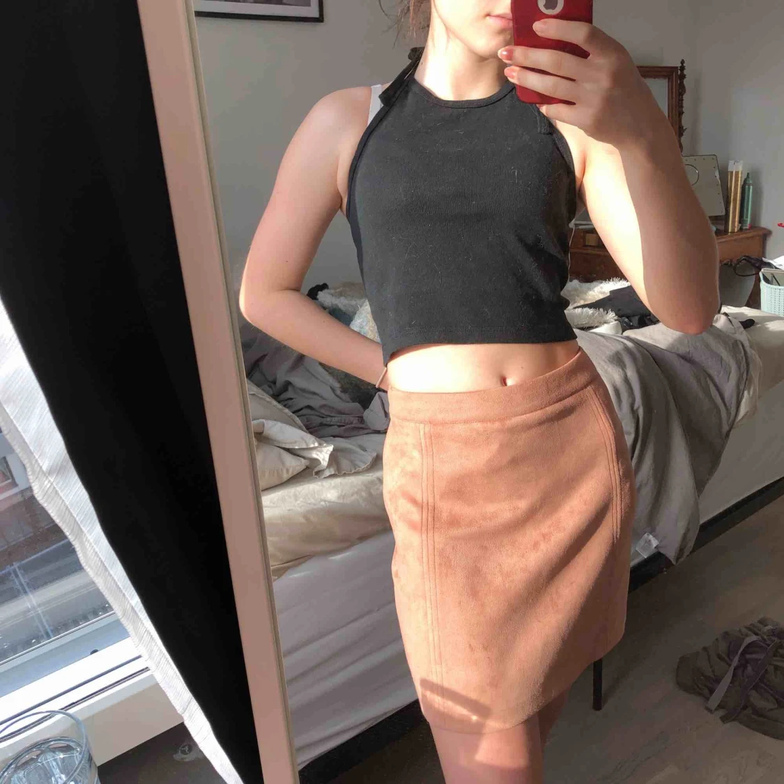 En rosa mocka kjol som kan vara högmidjad och normal. Har en dragkedja vid sidan. Säljer den för att den är lite för stor.