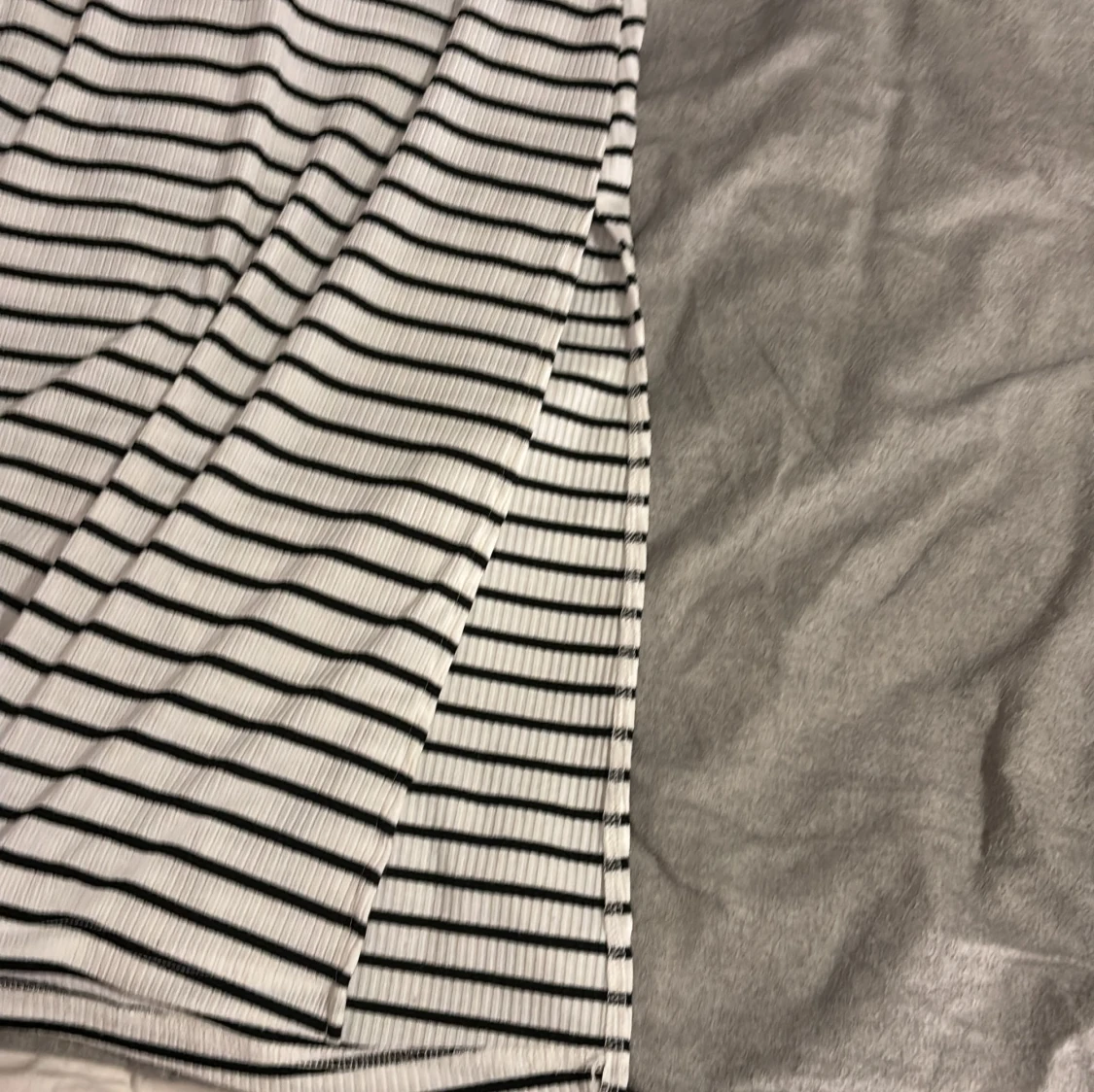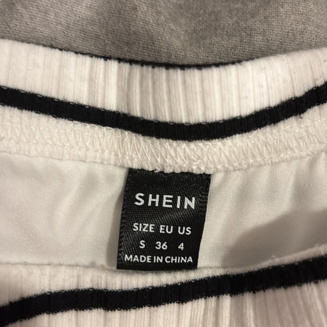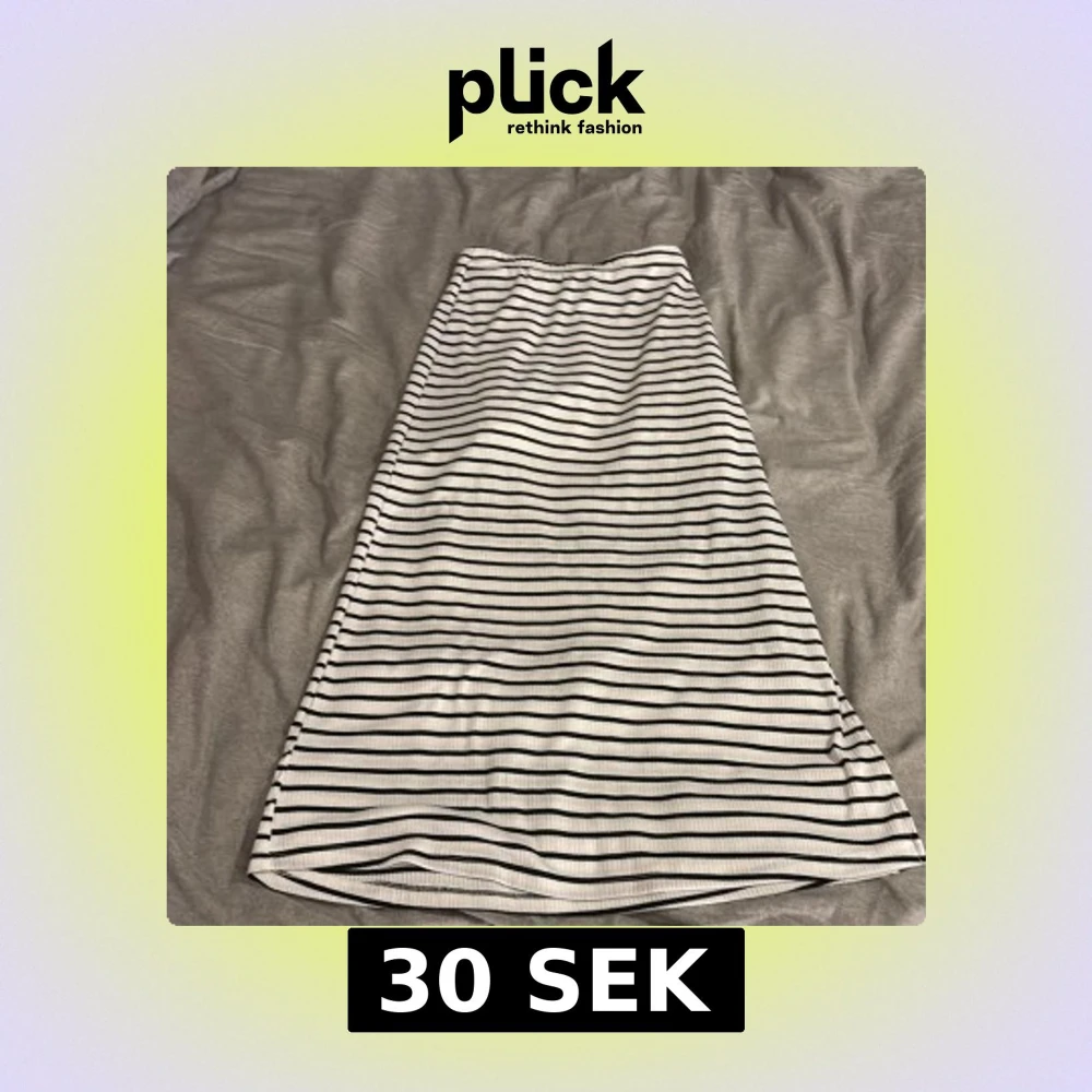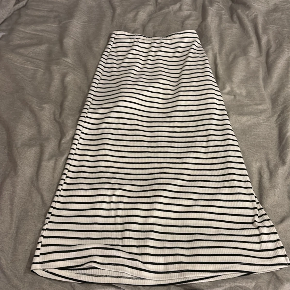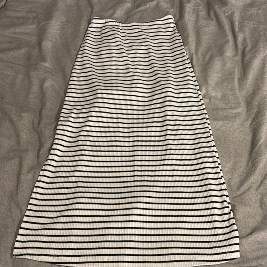 Vit och svart ribbad långkjol från SHEIN i storlek S. Kjolen har raka svarta ränder och är tillverkad i ett stretchigt, mjukt material. Perfekt för dig som gillar en clean och enkel stil med lite edge.
