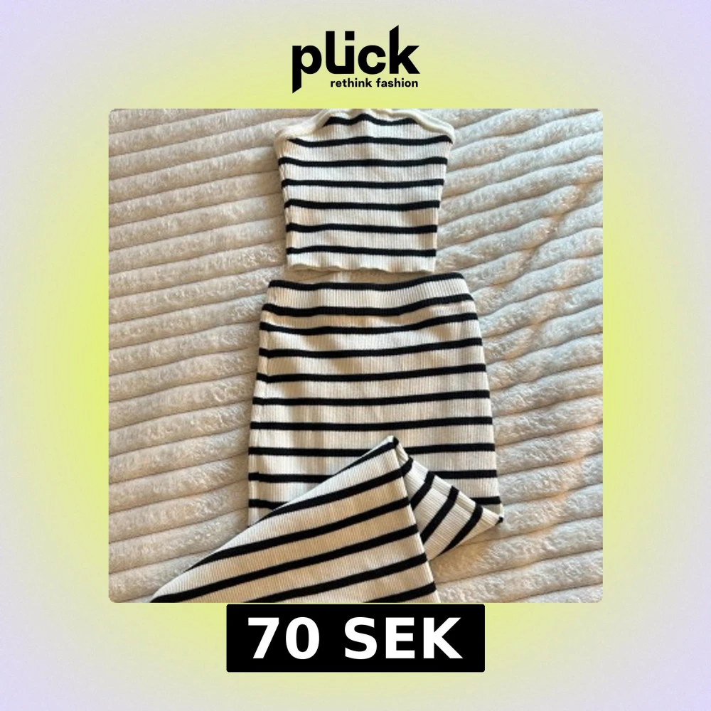 Säljer en snygg ribbstickad långkjol med topp i vitt med svarta horisontella ränder. Kjolen är figurnära och har en liten slits i sidan. Materialet är mjukt och stretchigt stickat, perfekt för en trendig look.