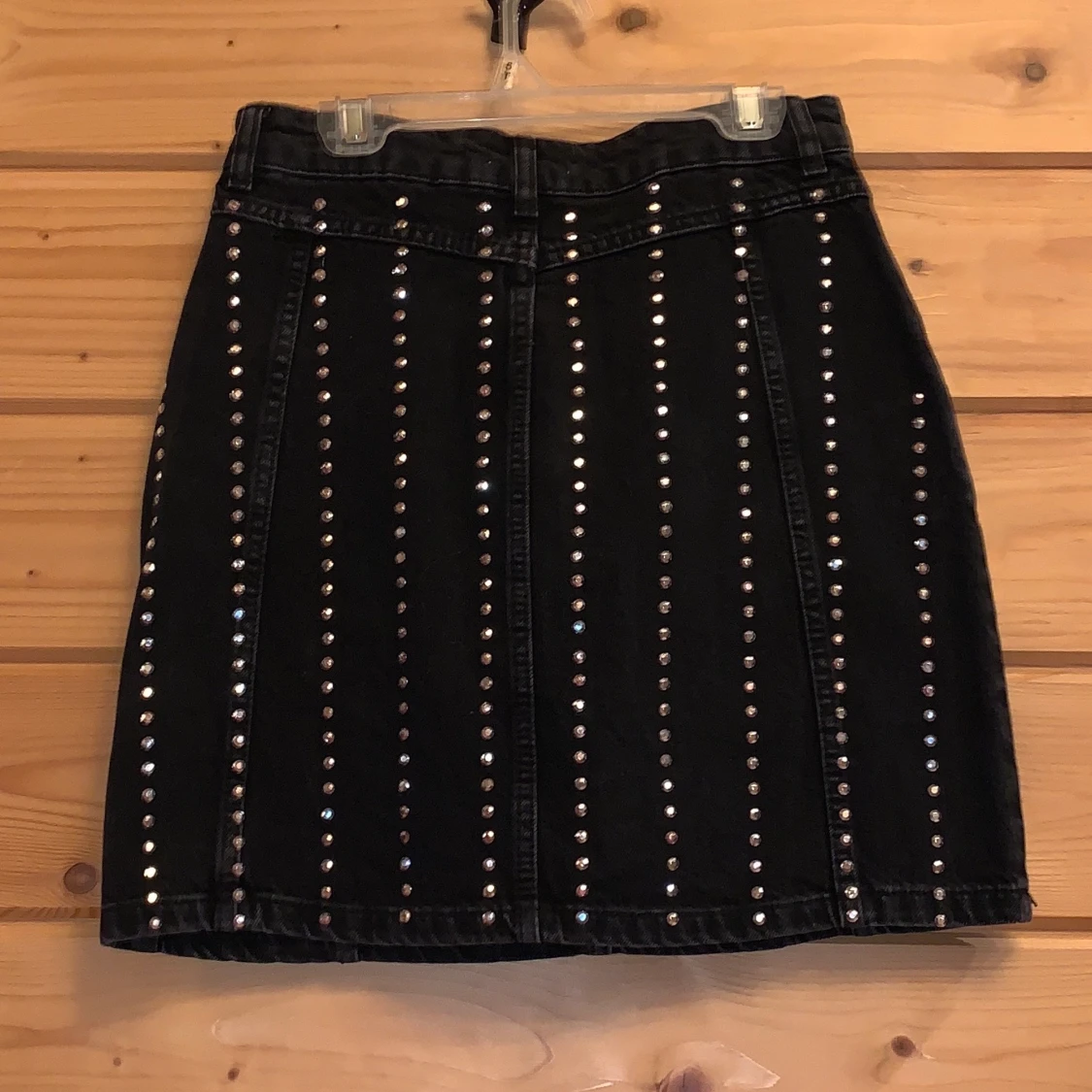 Känn dig som en riktig rockstjärna med den här denimkjolen med reflekterande paljetter! Materialet är 100% bomull och kjolen är 110% cool. Färgen är svartgrå med en tvättad effekt och kjolen har aldrig använts.