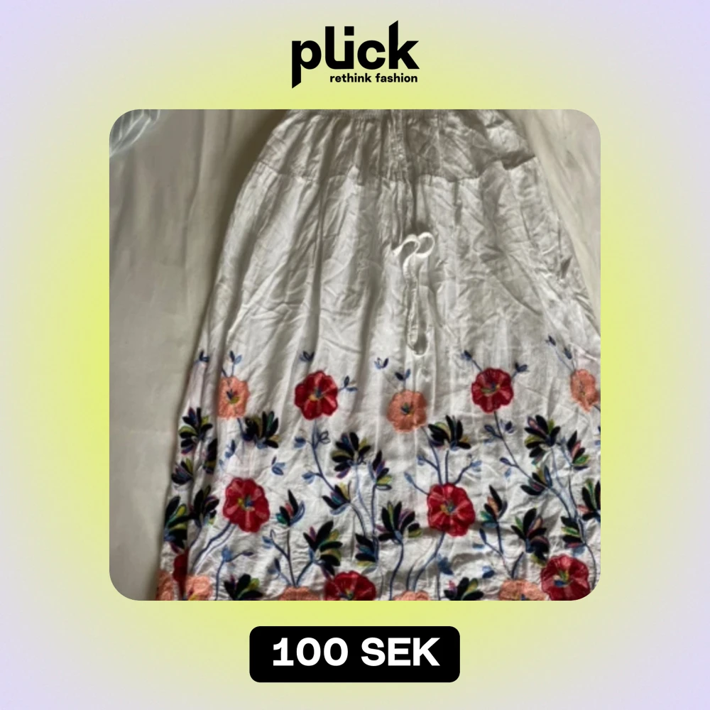 Säljer en superfin vit långkjol med färgglada broderade blommor. Kjolen har en elastisk midja med knytband för perfekt passform. Den är perfekt för sommarens alla fester och ger en bohemisk touch till din outfit. Materialet känns lätt och luftigt, vilket gör den idealisk för varma dagar.
