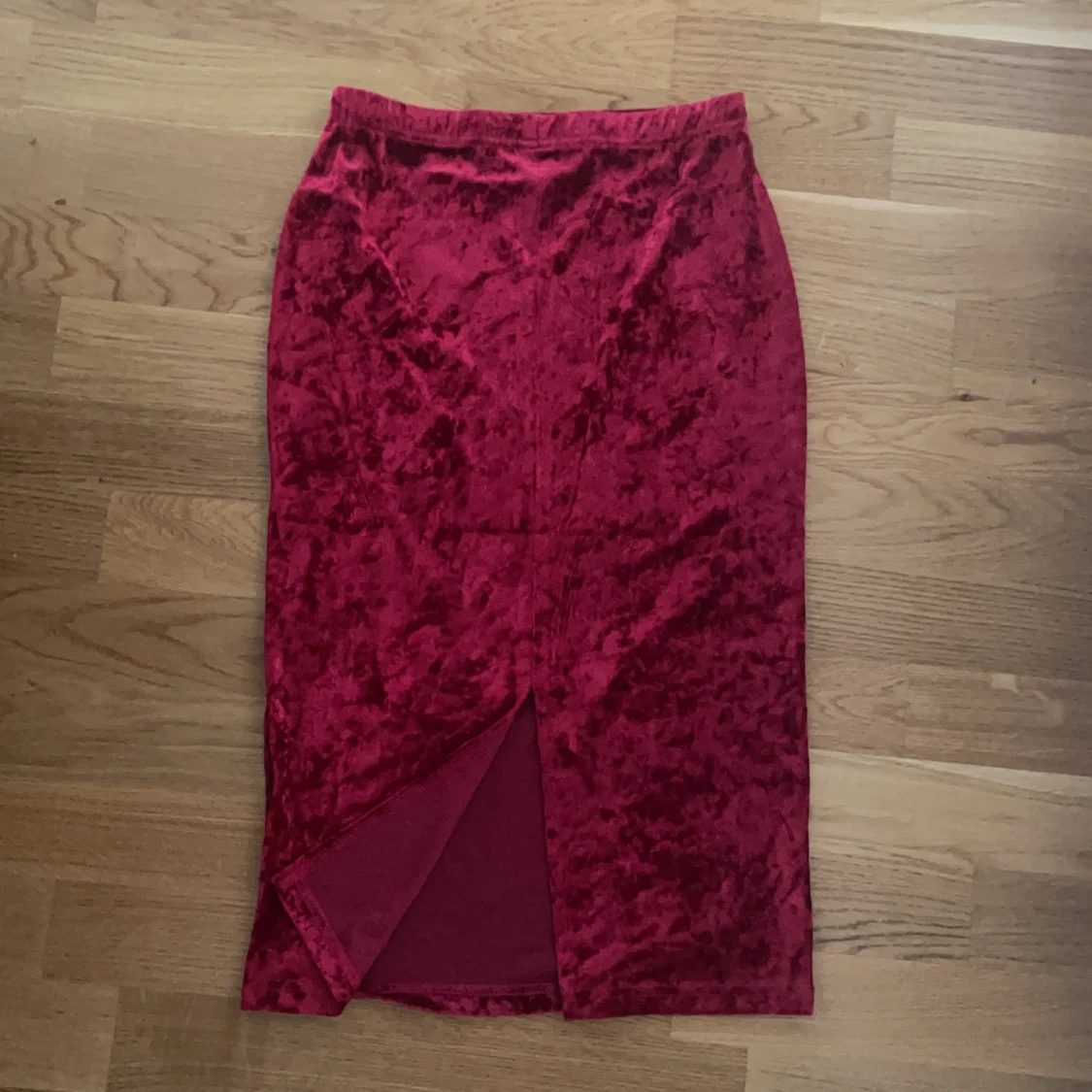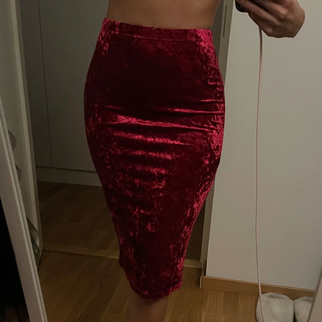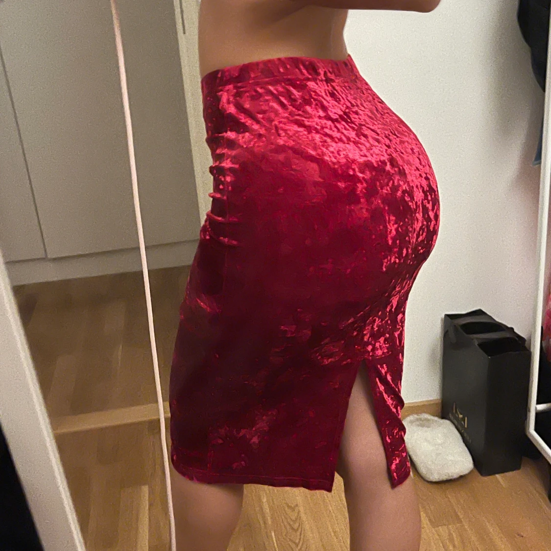 Röd kjol i sammetsmaterial, storlek xs, sitter lite tightare och har en slits i bak, men vill man inte ha slitsen bak så kan man vrida kjolen så att slitsen hamnar vid benet, aldrig använd
