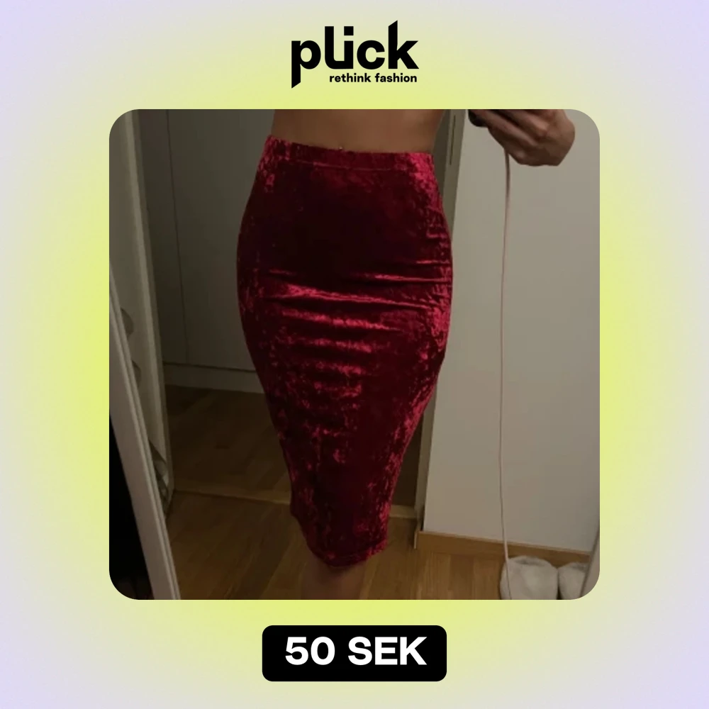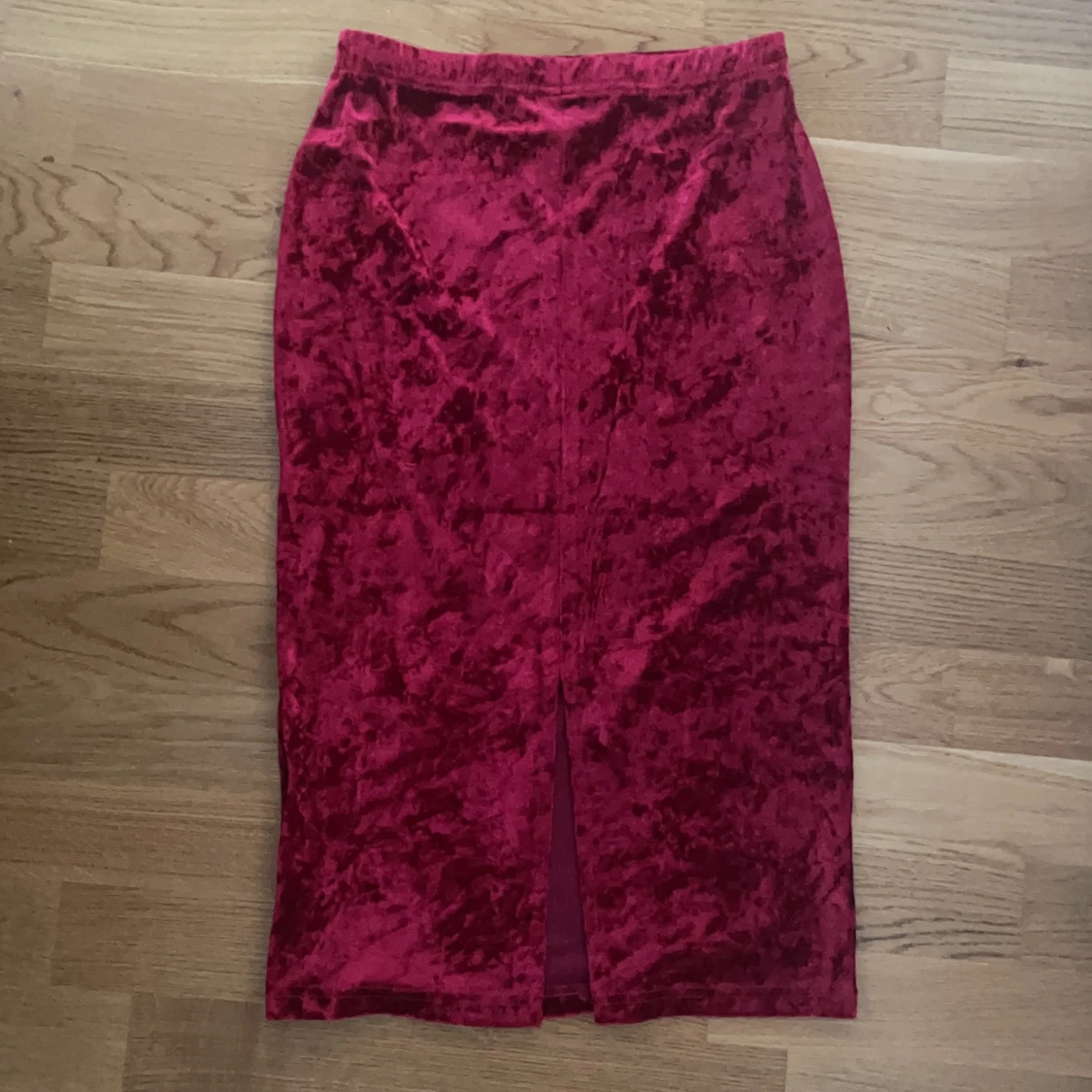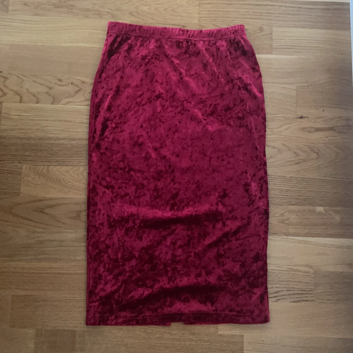 Röd kjol i sammetsmaterial, storlek xs, sitter lite tightare och har en slits i bak, men vill man inte ha slitsen bak så kan man vrida kjolen så att slitsen hamnar vid benet, aldrig använd