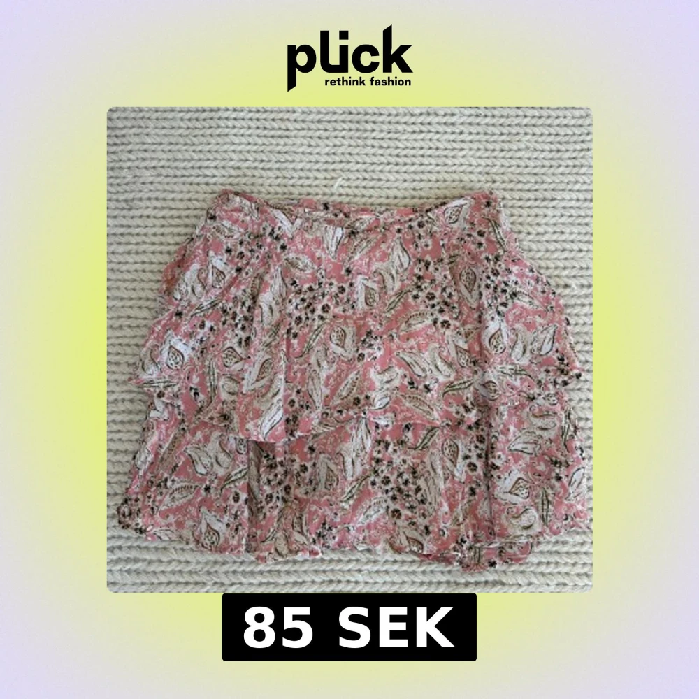 Säljer en söt rosa kjol med blommigt mönster och volangdetaljer. Perfekt för en somrig look. Kjolen har en omlott-design som ger en fin passform. Passar bra till både vardag och festliga tillfällen.