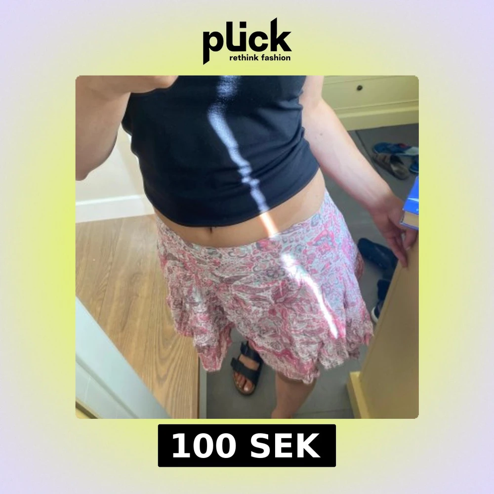 Säljer en kort kjol med volanger i ljusrosa och vita toner, med ett blommigt och paisleyinspirerat mönster. Kjolen har en flowy passform och är perfekt för varma dagar. Materialet känns lätt och luftigt, vilket gör den skön att bära.