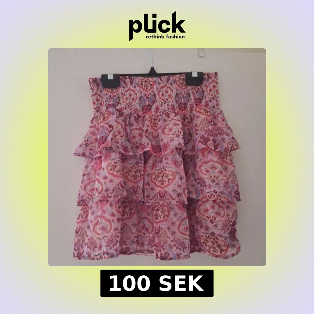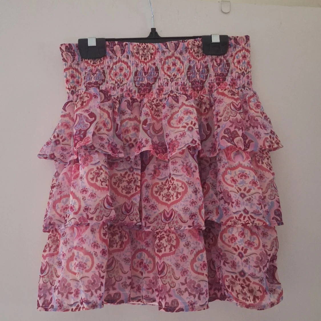 Supersöt volangkjol i rosa toner med blommigt och paisleyinspirerat mönster. Kjolen har flera lager volanger och smock i midjan för en bekväm passform. Kjolen är i storlek 158/164 men passar mig som har S💞