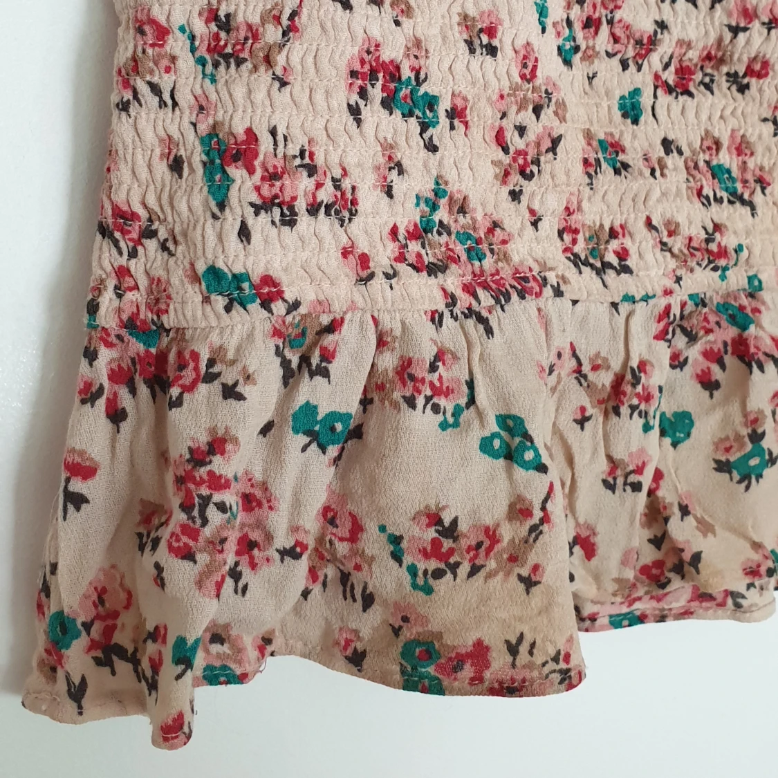 Comfy Mini Skirt with frills in a pink/green floral pattern Size: s, but it is extremely stretchy so it would fit an m without doubt Used although in great condition.