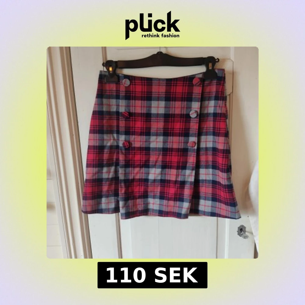 Säljer en rutig kortkjol i rött och blått med stora tygklädda knappar framtill. Kjolen har omlott-design och är fodrad med ett tunt mörkblått tyg på insidan. Perfekt för dig som gillar preppy och retrostil.