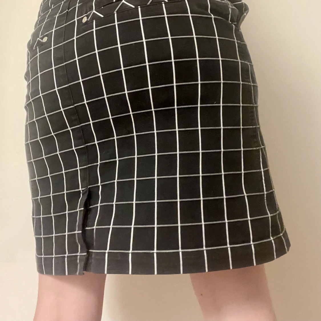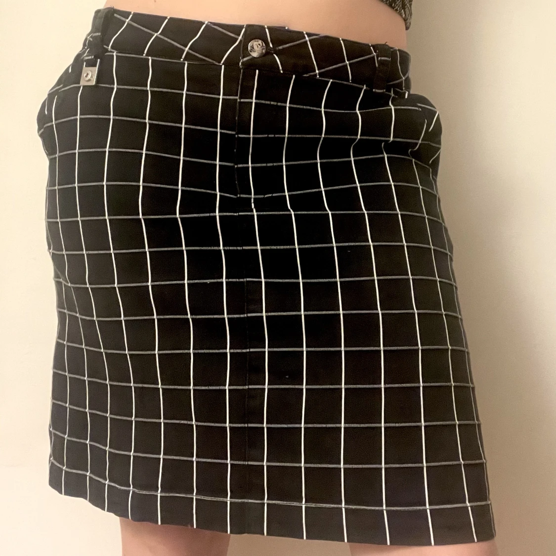 Kjol i svart med vitt rutmönster. Går typ till över knäna på mig som är 165 cm. Den står ut lite och har en slits där bak. Har även inbyggda shorts i kjolen. Lite stor på mig som brukar ha s-m men funkar lågmidjat. Kan mötas nära Mariatorget eller posta.