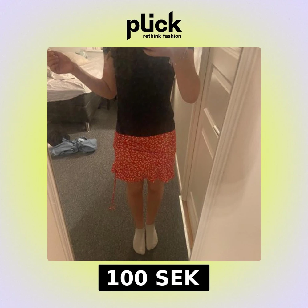 Superfin röd kortkjol med vita blommor och volangkant. Storlek S, knappt använd. Kjolen har snörning på sidan som ger en snygg detalj och lite extra form. Perfekt för dig som gillar färg och vill ha en söt look till sommaren.