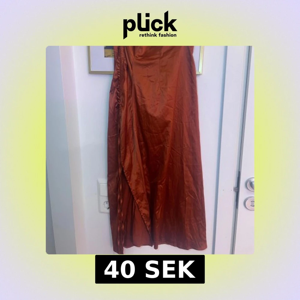 Elegant rostfärgad kjol i satin med omlott-design. Klänningen har en vacker glans och en smickrande passform. Perfekt för speciella tillfällen. Kjolen har slits på sidan med snören man kan dra åt! Kjolen har legat i en påse därav lite skrynklig