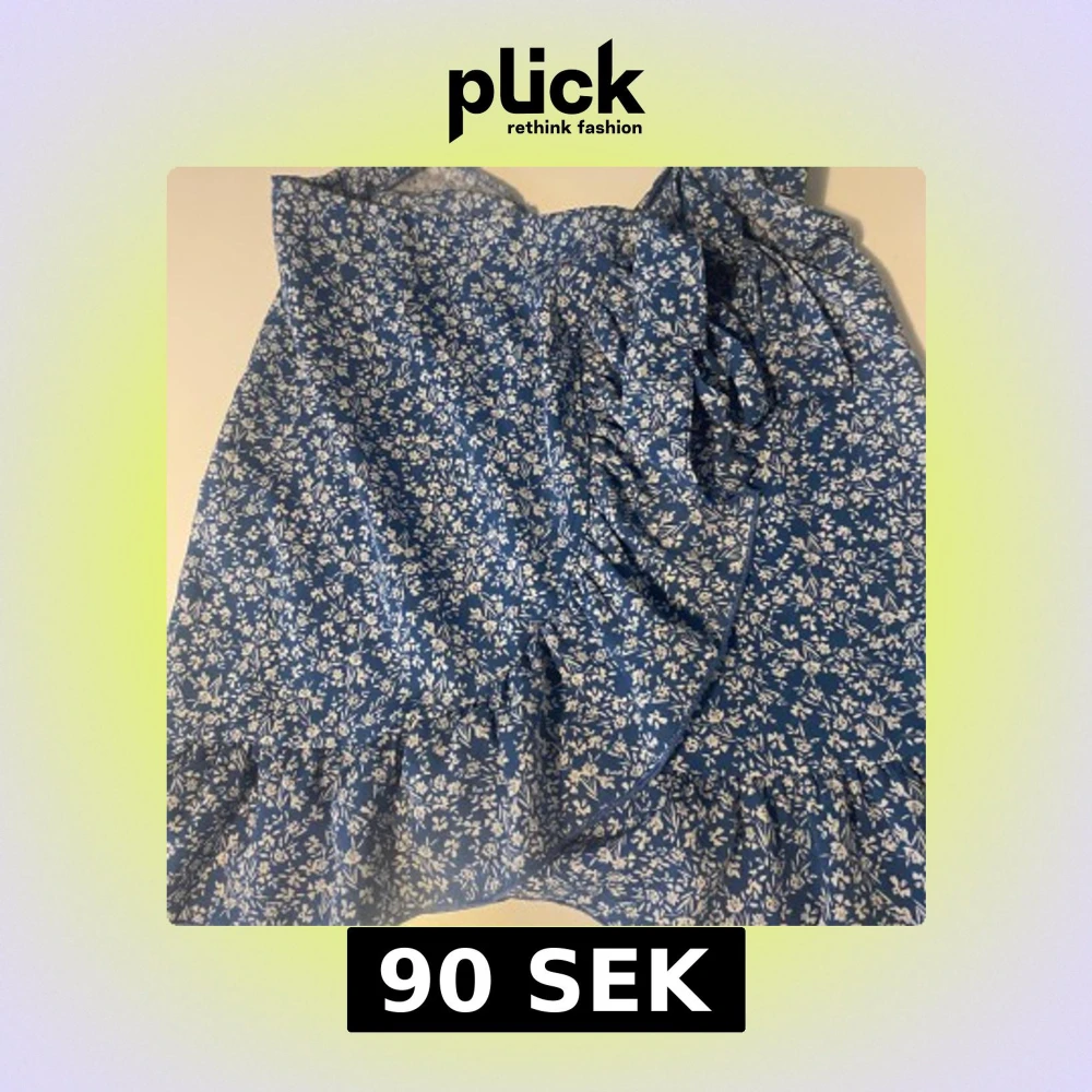 Supersöt blå kojol med vitt blommönster och volangdetaljer. Omlottmodell som knyts i sidan, perfekt för sommarens alla tillfällen.