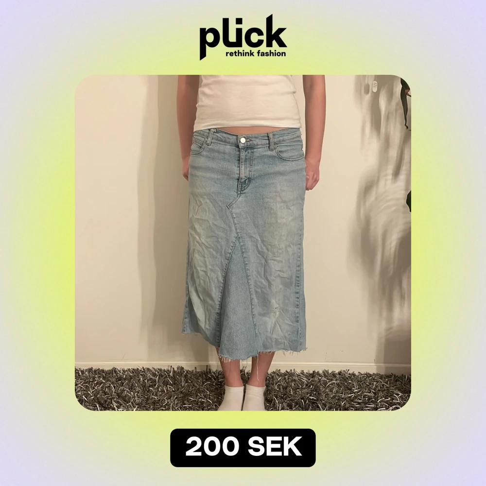 Säljer en snygg ljusblå jeanskjol i mycket bra skick. Kjolen har en klassisk femficksdesign och en cool asymmetrisk söm framtill. Perfekt för vår och sommar! Passar både till vardags och lite mer uppklädda tillfällen.